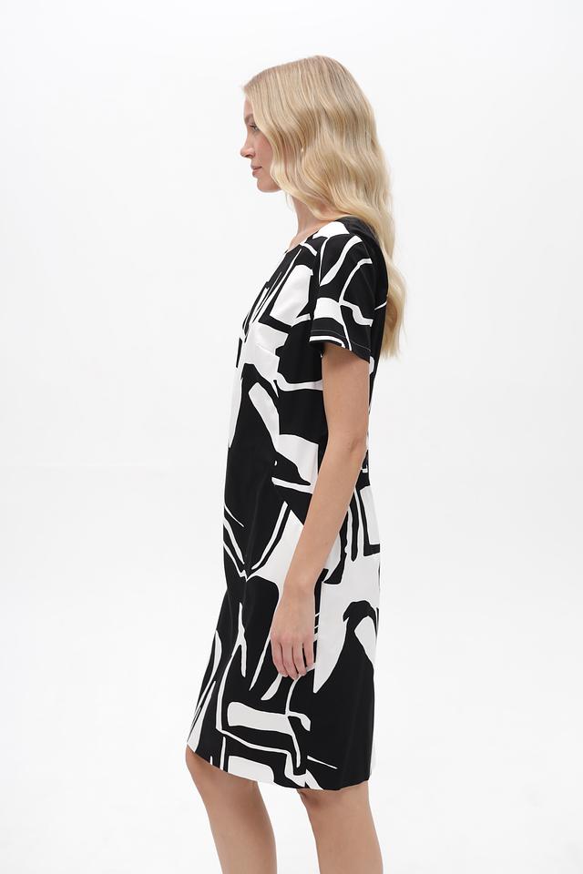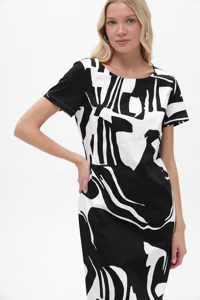 Платье имеет короткие рукава и округлый вырез горловины. Приталенный силуэт подчеркивает достоинства фигуры, а оригинальный черно-белый принт делает образ запоминающимся и современным.