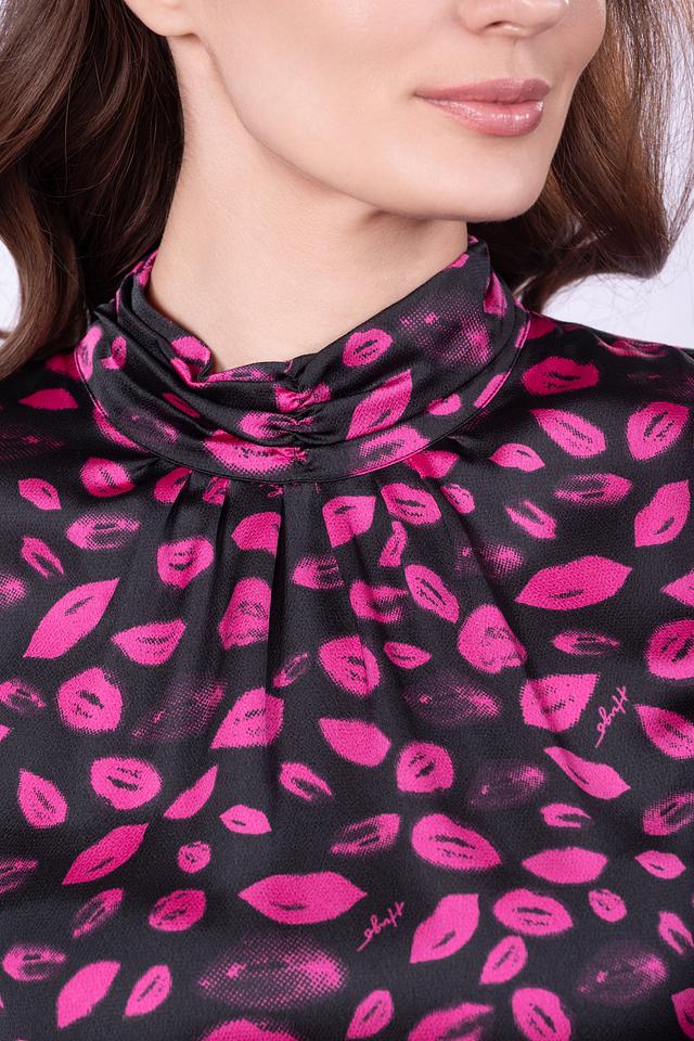 Основной цвет платья – чёрный, который служит идеальным фоном для яркого розового принта в виде губ. Такой рисунок добавляет образу игривости и кокетства. Платье имеет длину миди, что делает его универсальным для различных случаев.