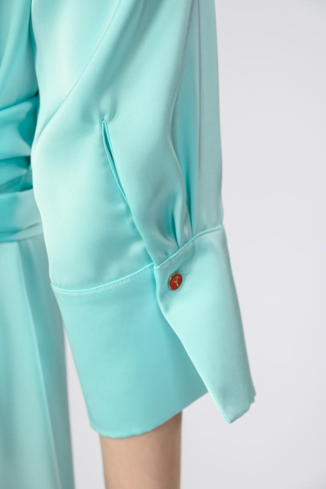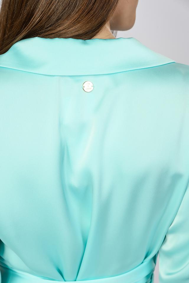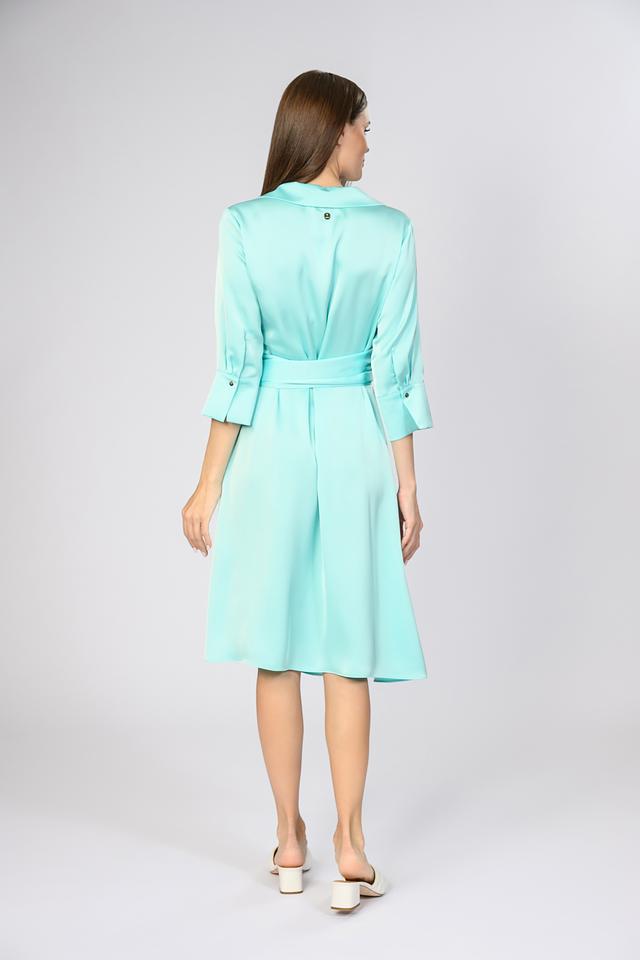Платье оснащено съёмным поясом, который можно завязать на талии, чтобы создать более выразительный силуэт. Длина миди делает его универсальным для различных случаев – от деловых встреч до вечерних мероприятий. Преобладающий цвет – нежный бирюзовый, который освежает образ и подходит к разным оттенкам кожи.