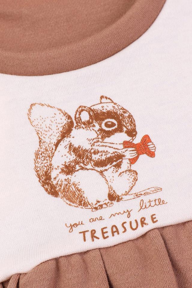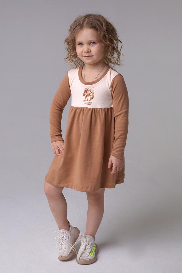 Платье КотМарКот – это стильная и удобная одежда для маленьких модниц. Модель выполнена в приятном коричневом цвете и украшена очаровательным принтом белки на бежевой вставке. Платье имеет длинные рукава и свободный крой, не сковывающий движения.