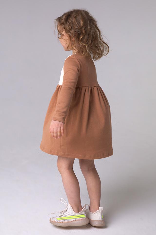Верх платья выполнен из бежевой ткани, а юбка – из коричневой. Переход между цветами подчеркнут эластичной лентой. Круглый вырез горловины дополнен оранжевой тесьмой. Платье идеально подходит для повседневной носки, прогулок и детских праздников.