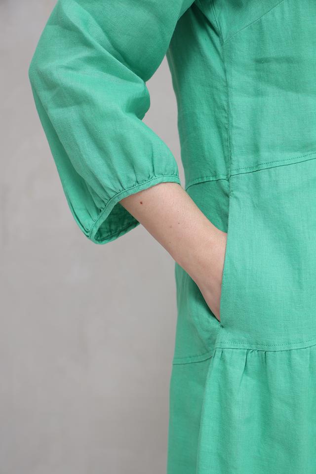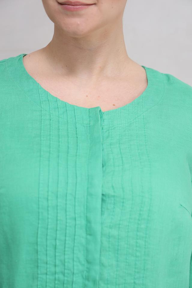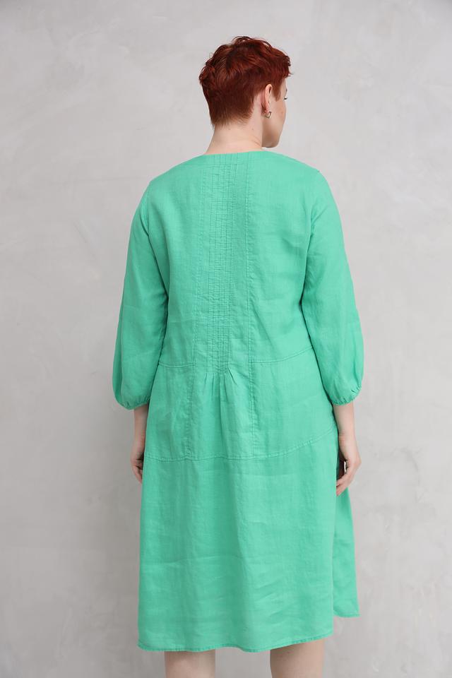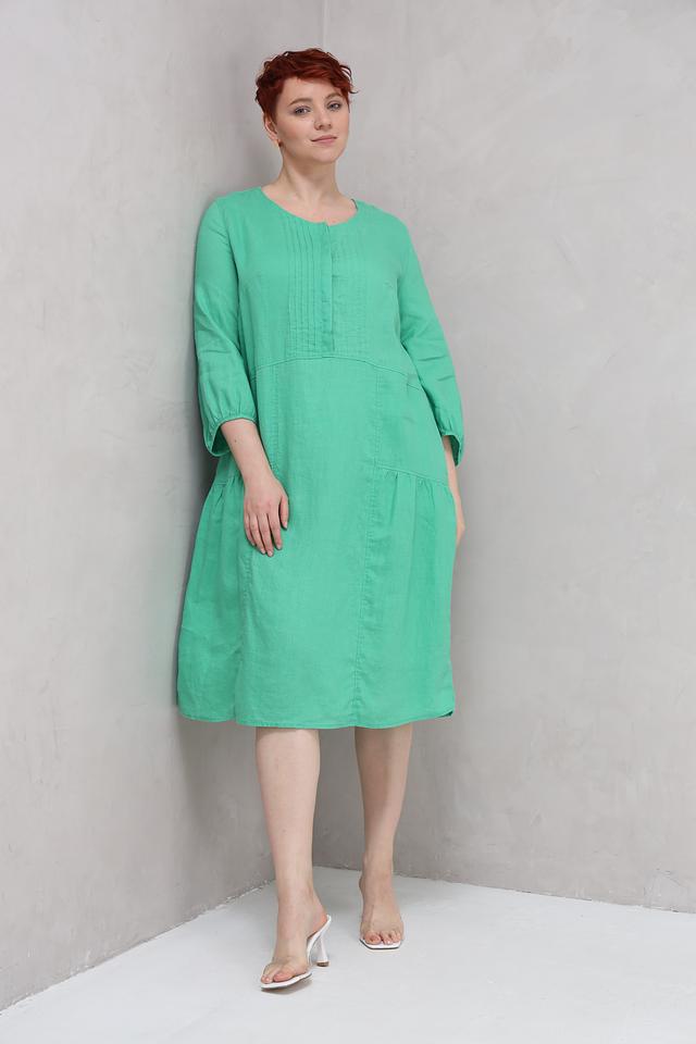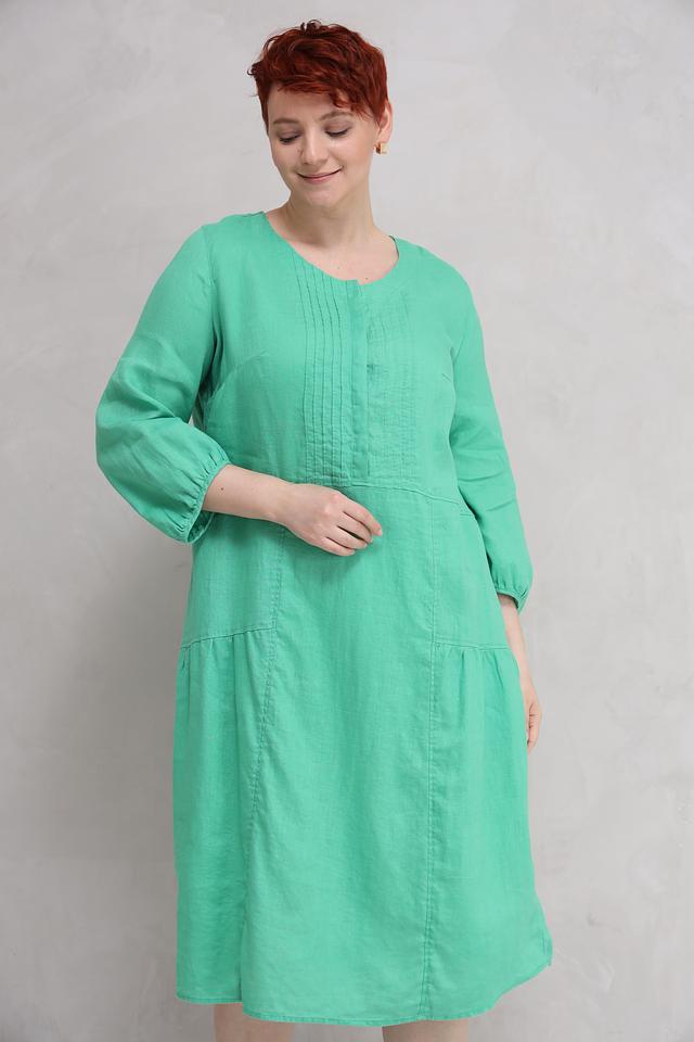Льняное платье Lebek мятного цвета – это комфорт и стиль в одном изделии. Платье свободного кроя с рукавами 3/4 и декоративной отделкой в виде складок на лифе, идеально подходит для создания повседневных образов. Состав: лен 100%