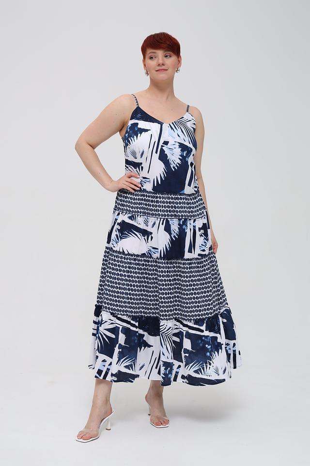 Основной цвет платья – синий, украшен ярким принтом с изображением тропических листьев и цветов. Верх платья имеет лиф с тонкими бретелями, а юбка выполнена в форме ярусов, что придает образу легкость и динамичность.