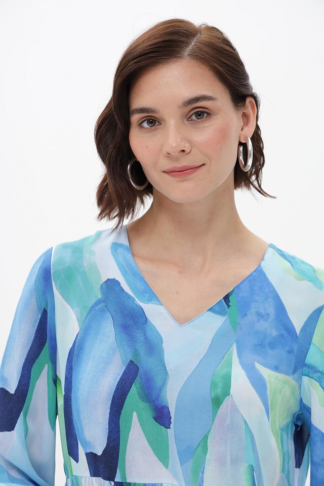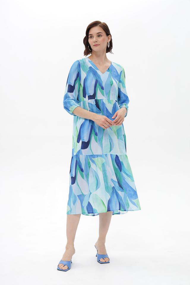 Особенностью этого платья является его яркий и необычный абстрактный принт в голубых и зелёных тонах. Силуэт платья свободный, А-образный, с заниженной линией талии и многослойной юбкой, что придает ему лёгкость и воздушность. V-образный вырез горловины и рукава 3/4 добавляют изящества.