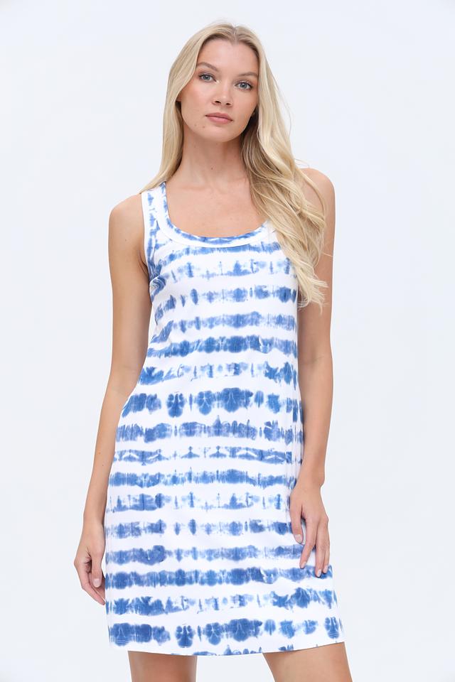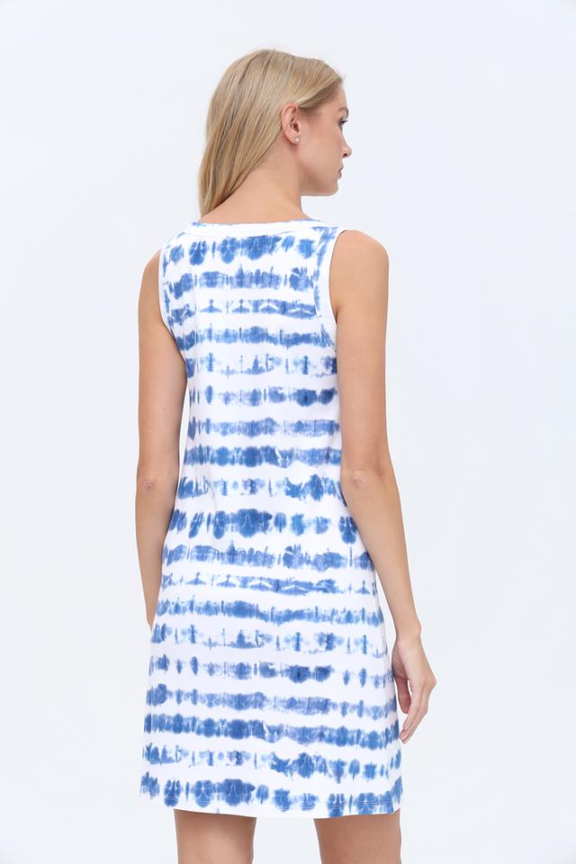 Основной цвет платья – голубой, с преобладанием белых участков, создающих эффект лёгкости и воздушности. Модель имеет прямой силуэт и длину чуть выше колена, что делает её универсальной для различных типов фигур.