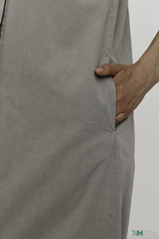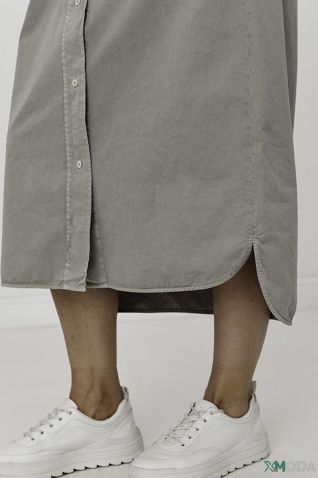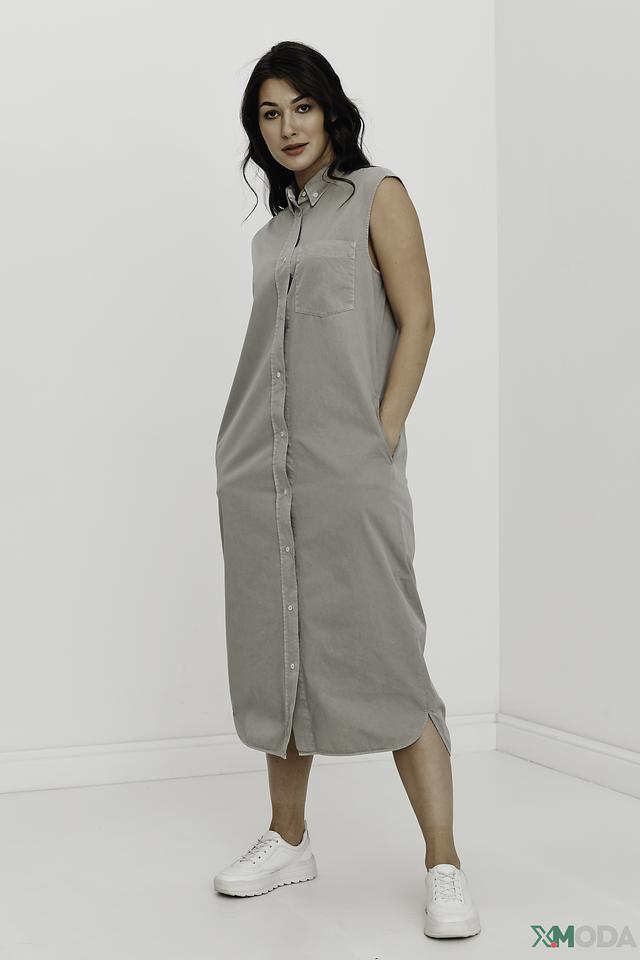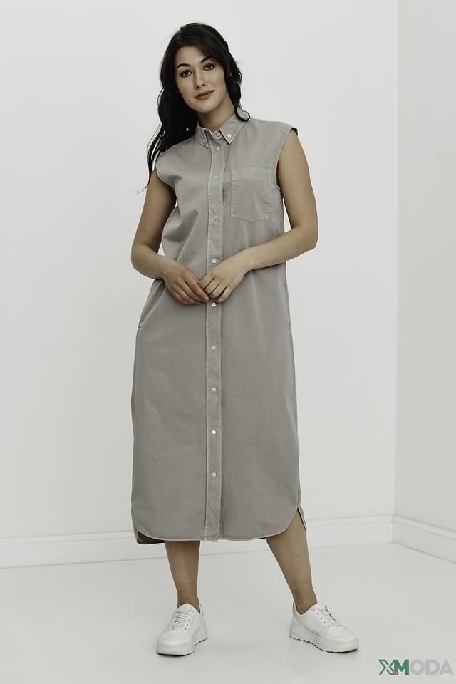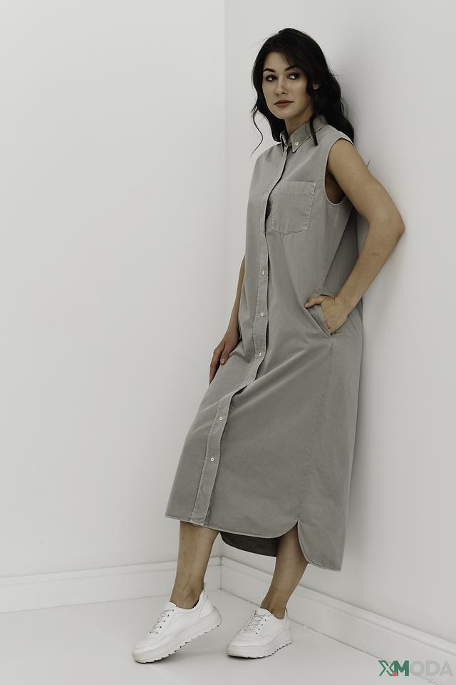 - Рубашечный стиль: Модель дополнена классическим отложным воротником и полноразмерной пуговичной планкой по всей длине, что придает платью элегантность и структуру рубашки.