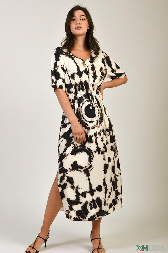 Платье Erfo чёрно-белого цвета с оригинальным принтом в стиле тай-дай. Легкая вискоза и свободный крой обеспечивают комфорт и свободу движений, а V-образный вырез и боковой разрез добавляют образу женственности. Состав: вискоза 95%, эластан 5%