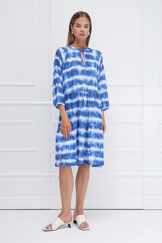 Это платье от Monari станет прекрасным дополнением к вашему летнему гардеробу. Модель выполнена в технике tie-dye, сочетающей различные оттенки синего и белого, что придает ей неповторимый и яркий вид.