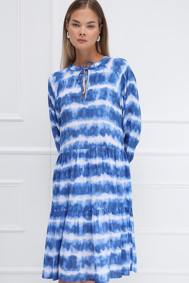 Синее платье Monari в технике tie-dye – стильное и комфортное решение для летнего гардероба. Модель выполнена из мягкой вискозы, имеет многоярусную юбку и завязки на горловине. Состав: вискоза 100%