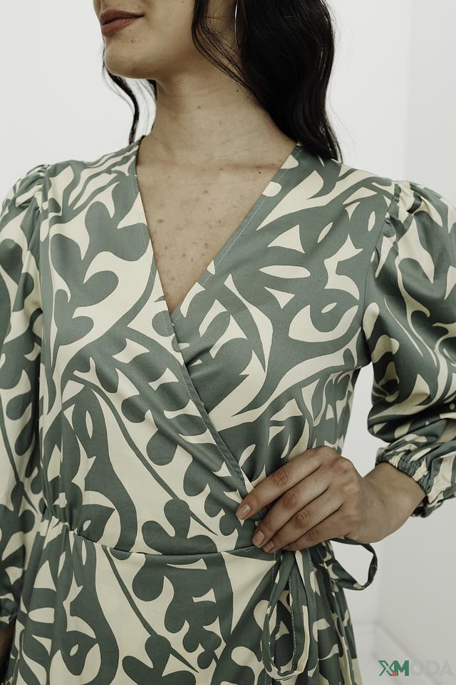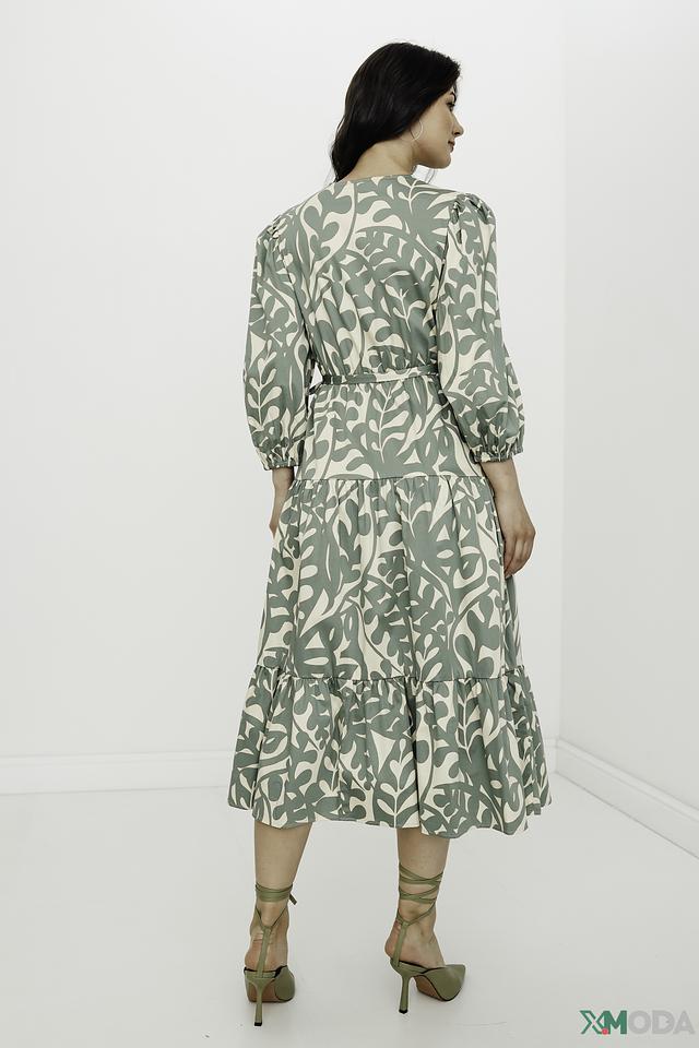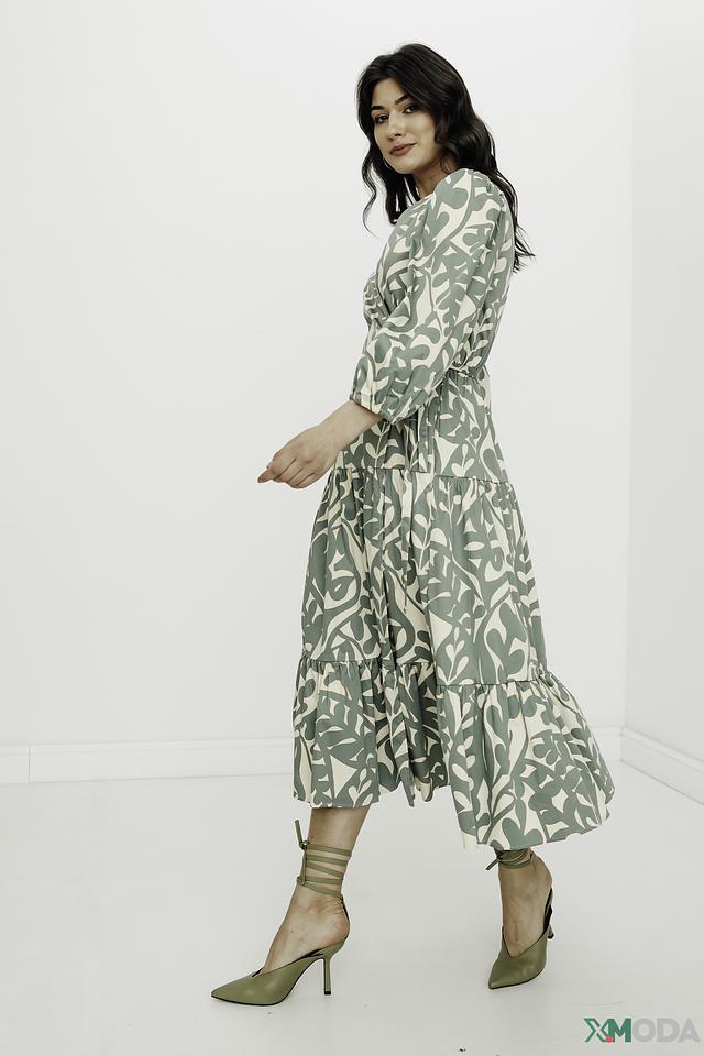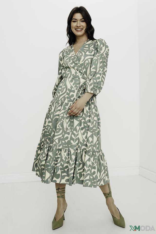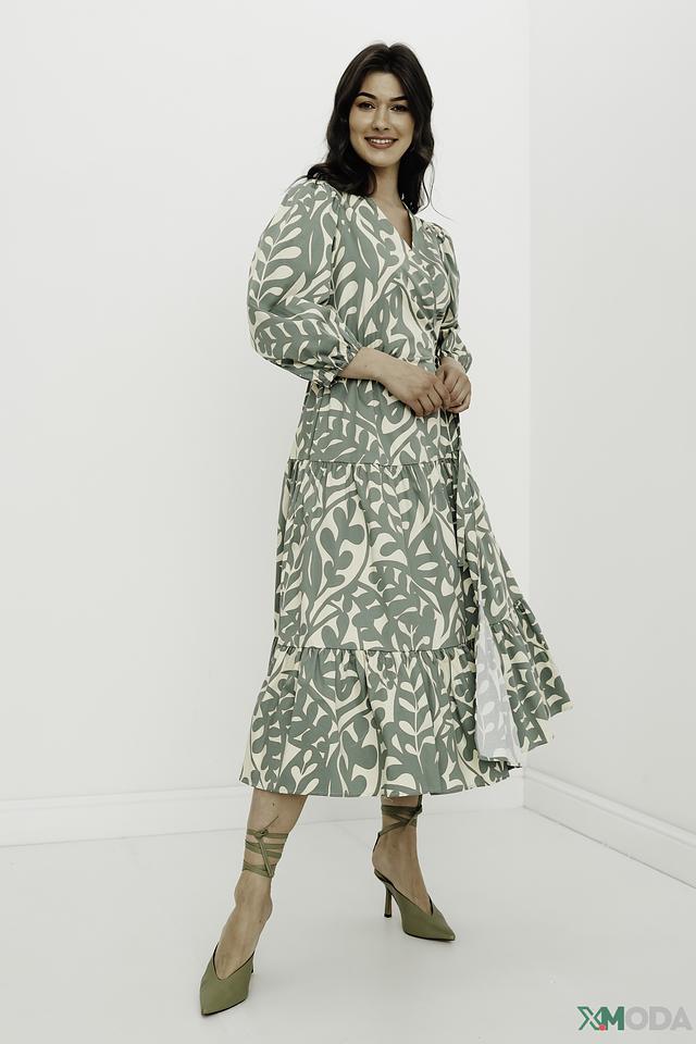 Модель имеет V-образный вырез и завязывается на талии, создавая женственный силуэт. Рукава 3/4 и юбка-солнце добавляют образу легкости и воздушности. Платье украшено оригинальным растительным принтом в нежных оттенках зеленого и бежевого.