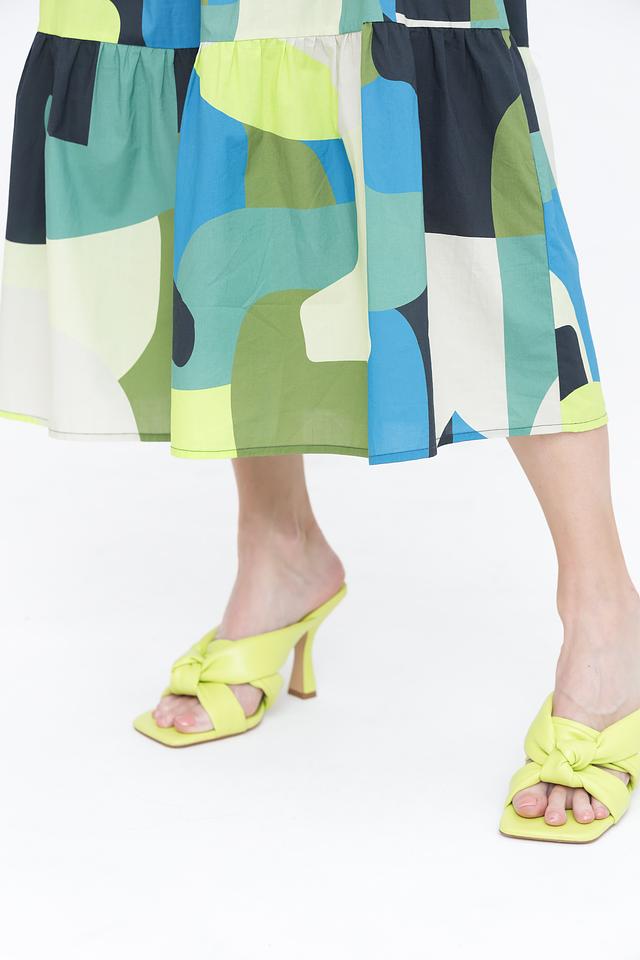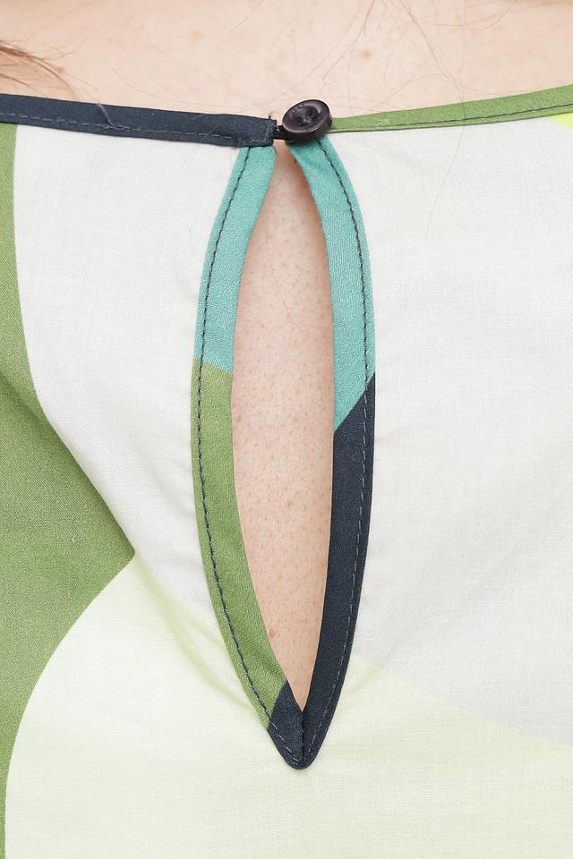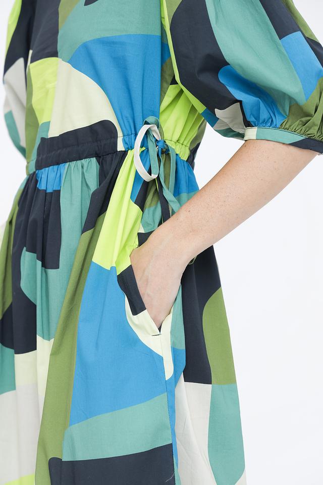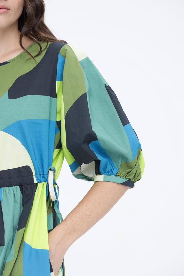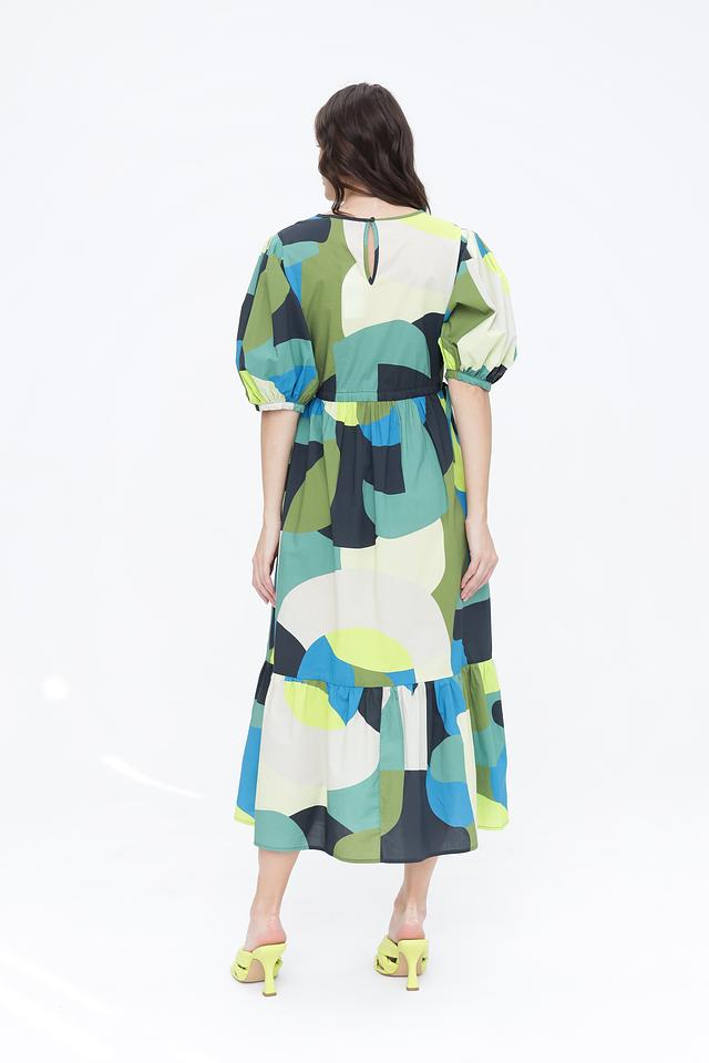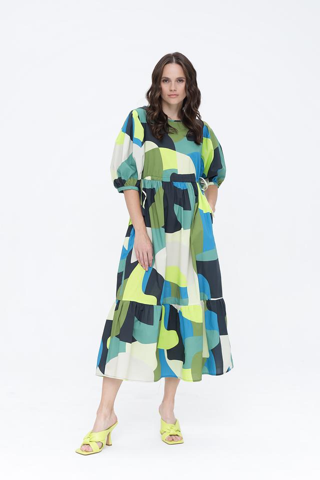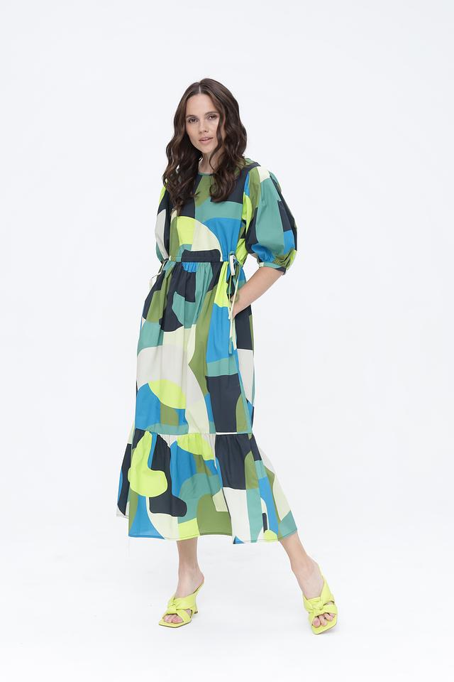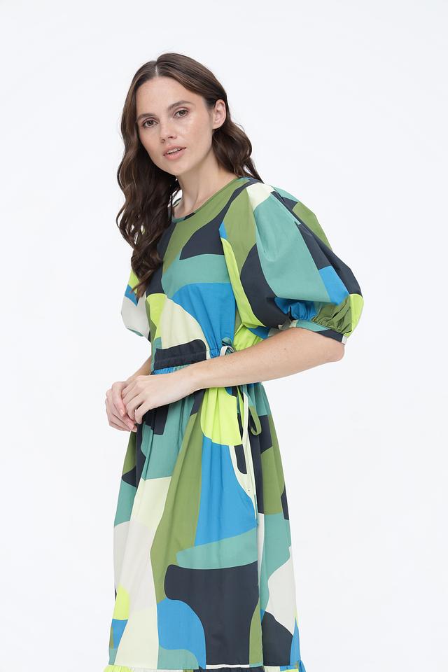 Платье имеет яркий геометрический принт, сочетающий в себе оттенки зелёного, голубого, жёлтого и тёмно-синего цветов. Силуэт платья свободный, А-образный, с акцентом на талии благодаря завязкам. Рукава 3/4 с манжетами добавляют образу изысканности.