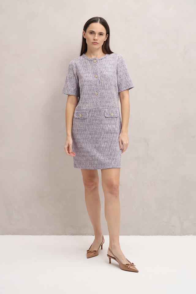 Платье Oui из текстурированной ткани в клетку сине-белого цвета с короткими рукавами и золотистыми пуговицами. Элегантный силуэт и удобный крой делают его отличным выбором для повседневной носки. Состав: полиэстер 47%, хлопок 35%, вискоза 14%, метализ.нить 2%, эластан 1%, полиамид 1%