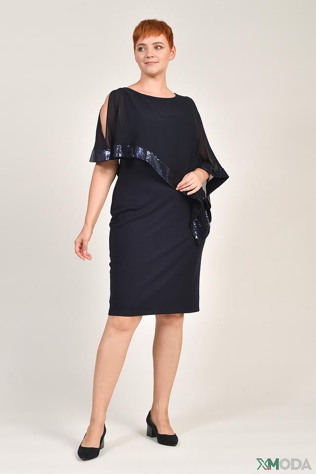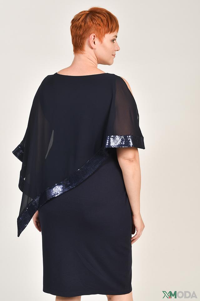 Особенностью платья являются рукава-воланы, выполненные из полупрозрачной ткани и декорированные мерцающими пайетками. Этот элемент придает образу нарядность и оригинальность. Вырез горловины округлый, что обеспечивает комфортную посадку.