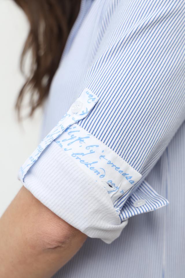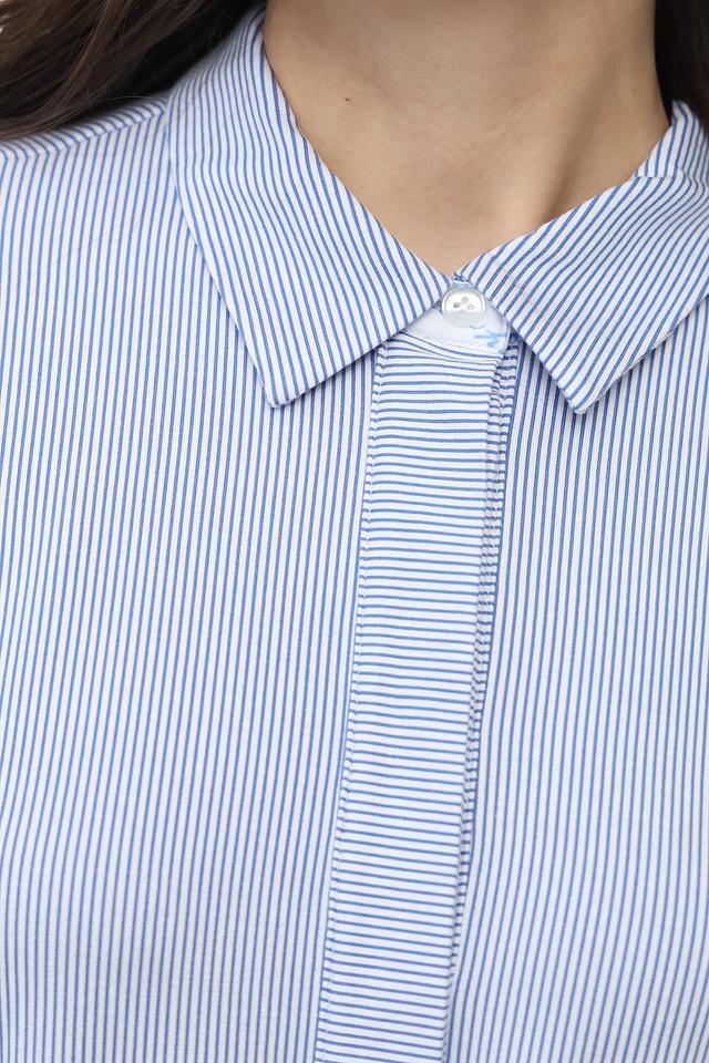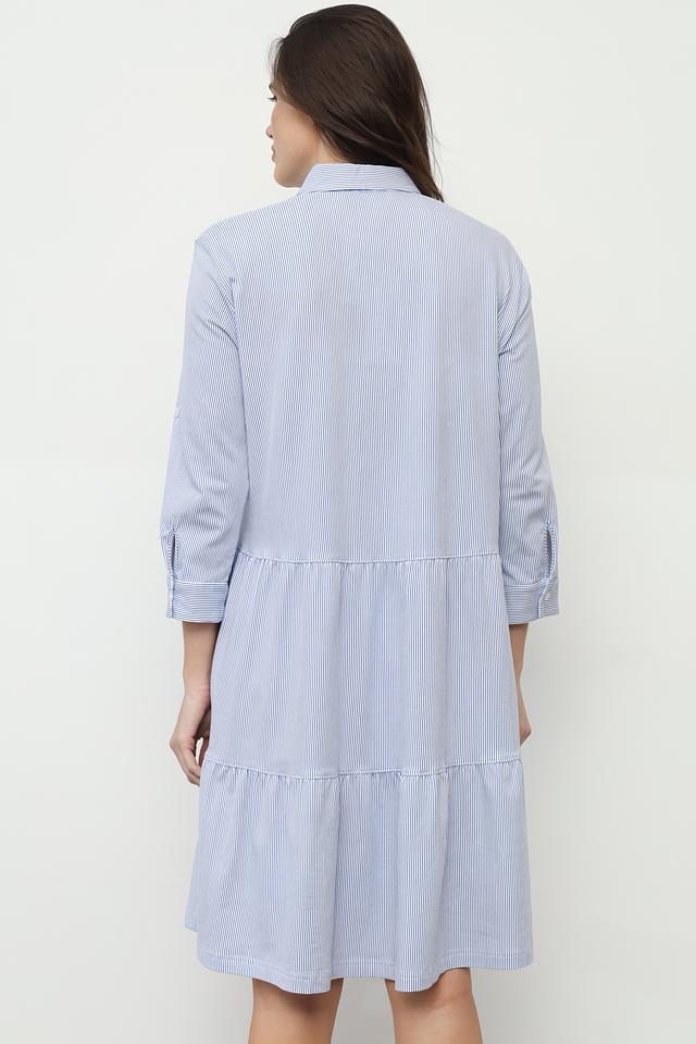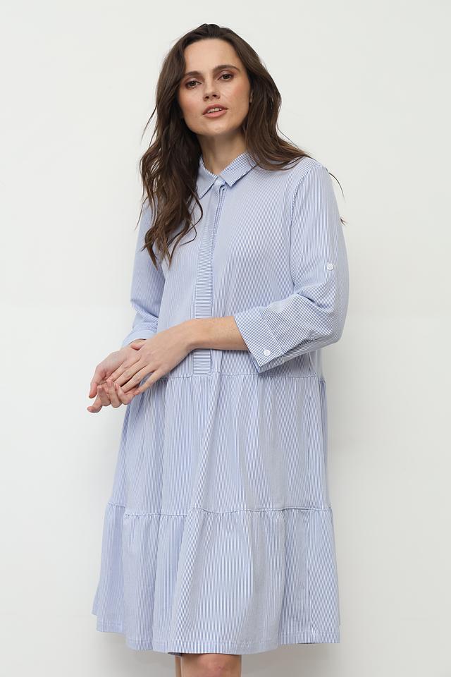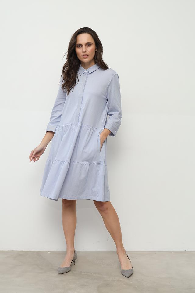 Это платье от SE Stenau выполнено в классическом стиле с акцентом на удобство и практичность. Основной цвет – голубой, дополненный вертикальной полоской белого цвета.