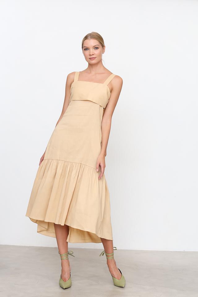 Модель имеет прямой крой, квадратный вырез и тонкие бретели. Особый акцент сделан на асимметричном подоле с оборками, который придает платью лёгкость и воздушность. Завязки на спине в виде бантов добавляют образу женственности и изящества.