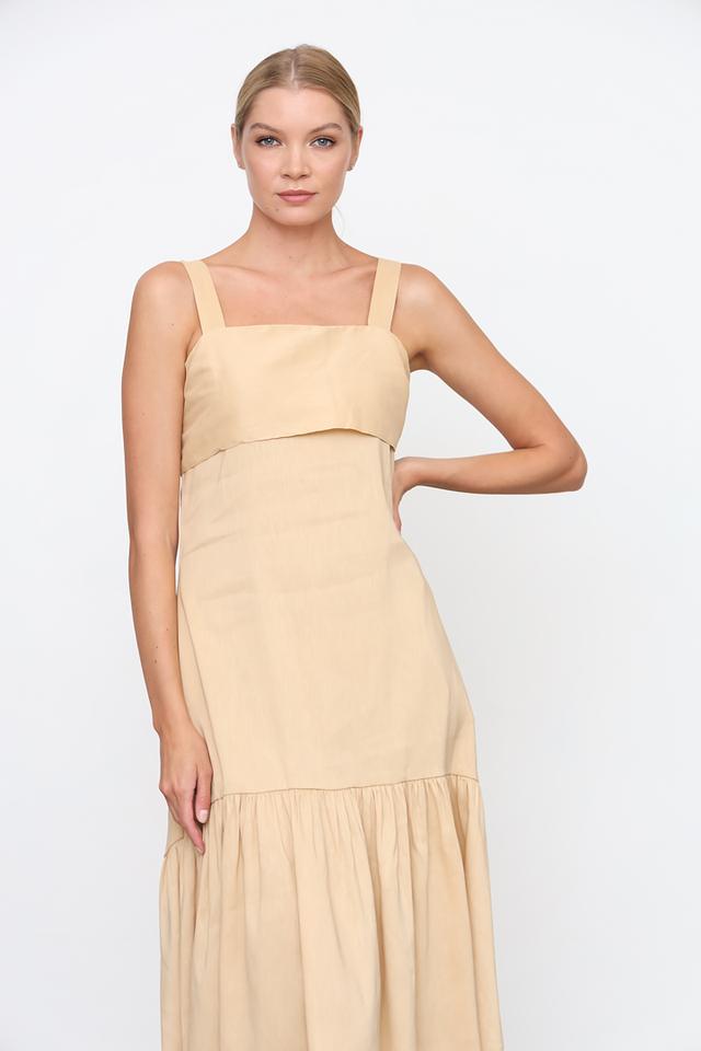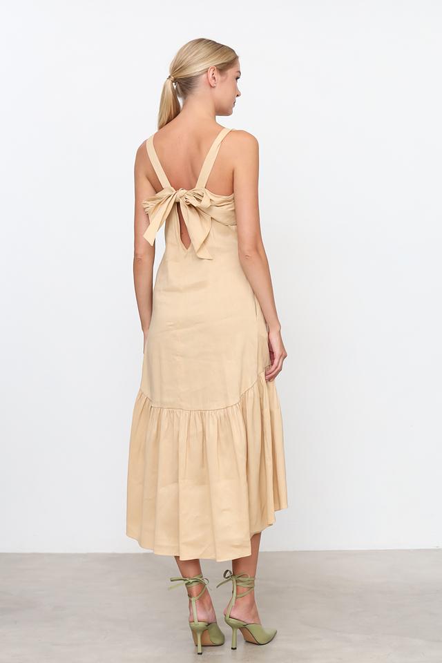 Бежевое платье от Silvian Heach – это стильное и лёгкое решение для летнего гардероба. Модель выполнена из натурального льна с вискозой, имеет квадратный вырез и асимметричный подол с оборками, а также завязки с бантом на спине. Состав: лен 62%, вискоза 36%, эластан 2%