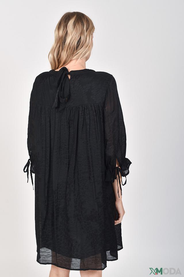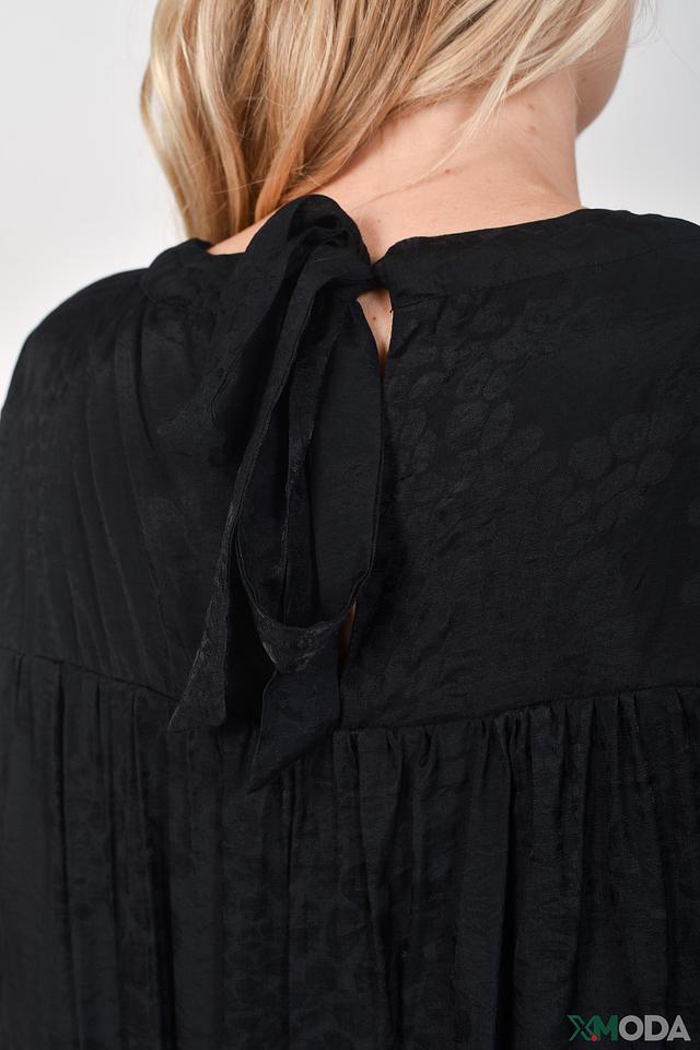 Ткань платья – лёгкая и приятная к телу, обеспечивающая комфорт в течение всего дня. Застёжка выполнена в виде завязок на горловине, что позволяет регулировать глубину выреза. Состав подкладки: вискоза 100%, модал 60%, полиамид 40%.