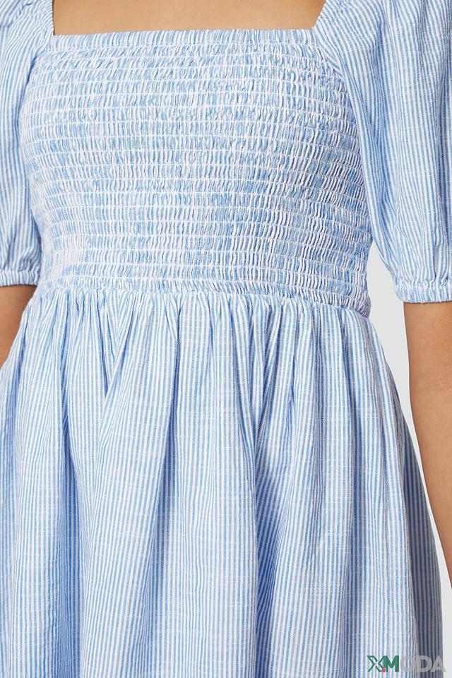 Модель имеет квадратный вырез горловины и короткие рукава-фонарики, собранные по краю манжетами. Линия талии подчеркнута сборкой, создающей лёгкий силуэт. Платье выполнено из 100% хлопка, что обеспечивает комфорт и воздухопроницаемость в течение всего дня.