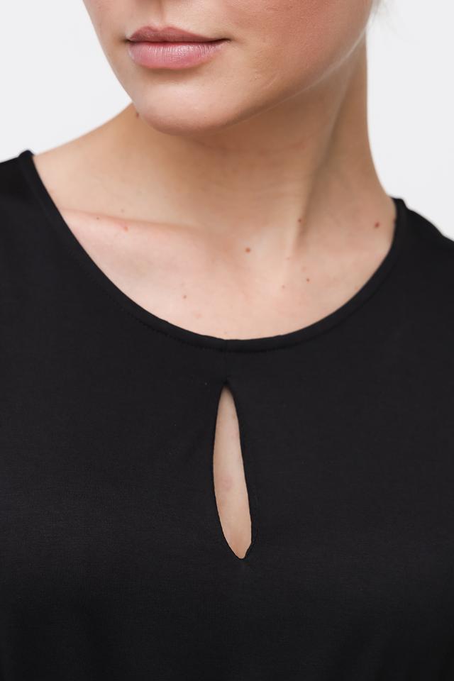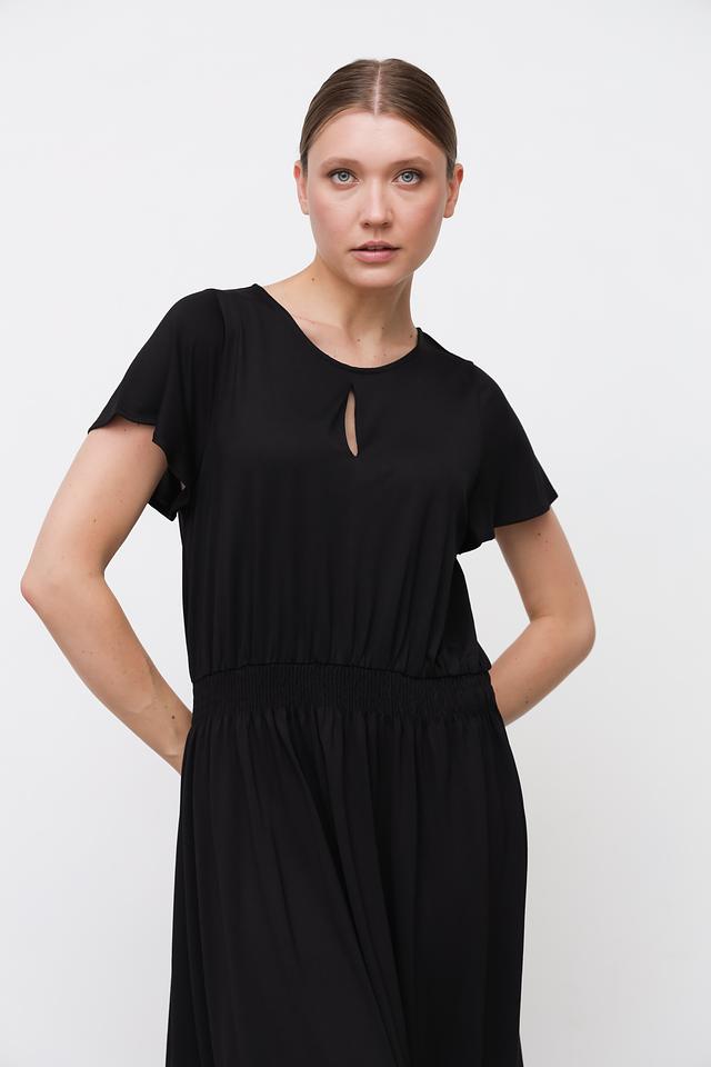 Чёрное платье от Taifun – это элегантность и комфорт в одном изделии. Модель выполнена из мягкой ткани с добавлением модала, имеет удобную завышенную талию на резинке и небольшой вырез на горловине. Состав: модал 65%, полиэстер 35%
