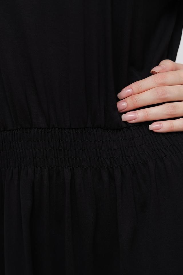 Модель имеет прямой крой, короткие рукава и длину миди. Завышенная талия на эластичной резинке обеспечивает комфортную посадку и подчеркивает фигуру. Небольшой вырез на горловине добавляет образу изысканности.