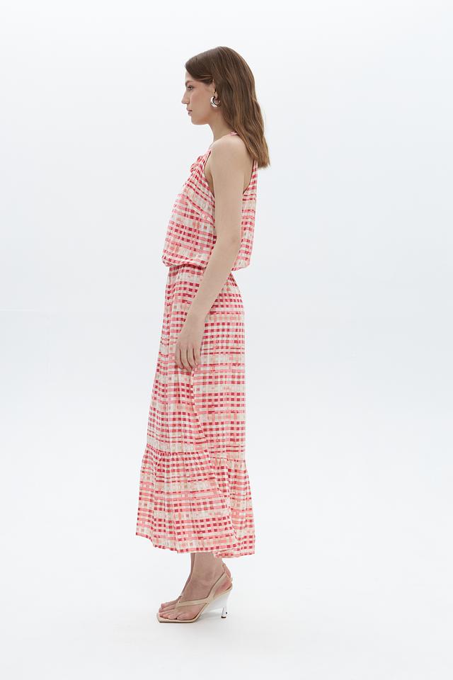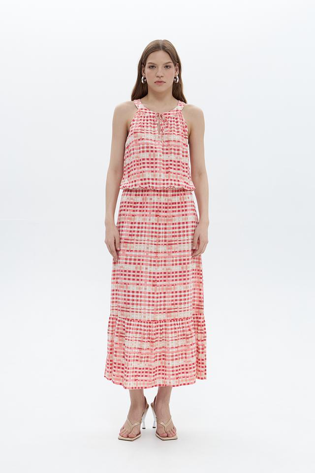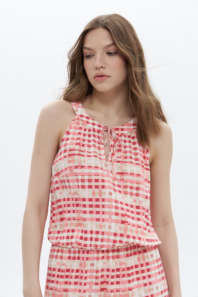 Это летнее платье от Tom Tailor выполнено из 100% вискозы, что делает его приятным к телу и комфортным в жаркую погоду. Платье имеет яркий клетчатый принт в красных и белых тонах, который придаёт ему свежий и летний вид.