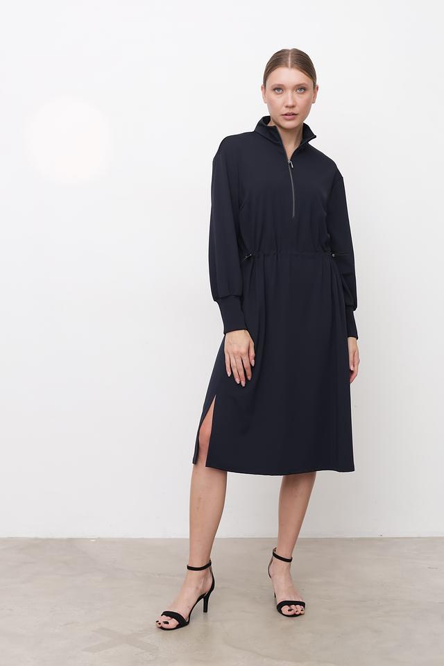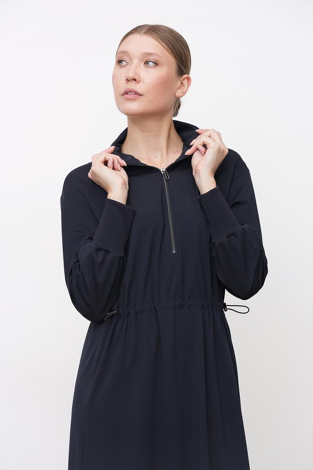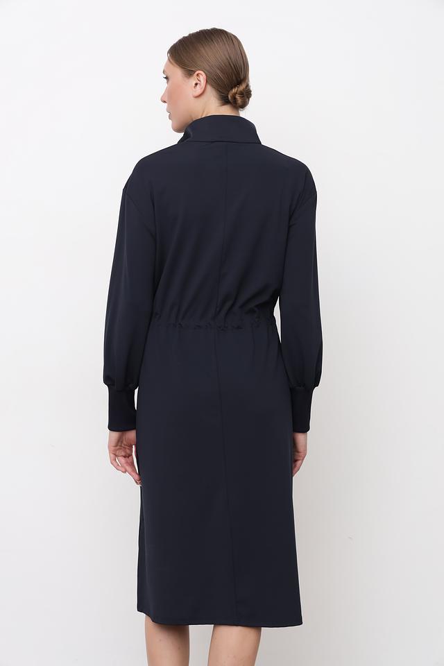 Платье имеет прямой силуэт, длину миди и длинные рукава с манжетами. Застежка – молния, расположенная на горловине, что добавляет модели оригинальности. Талию можно подчеркнуть с помощью кулиски с завязками.
