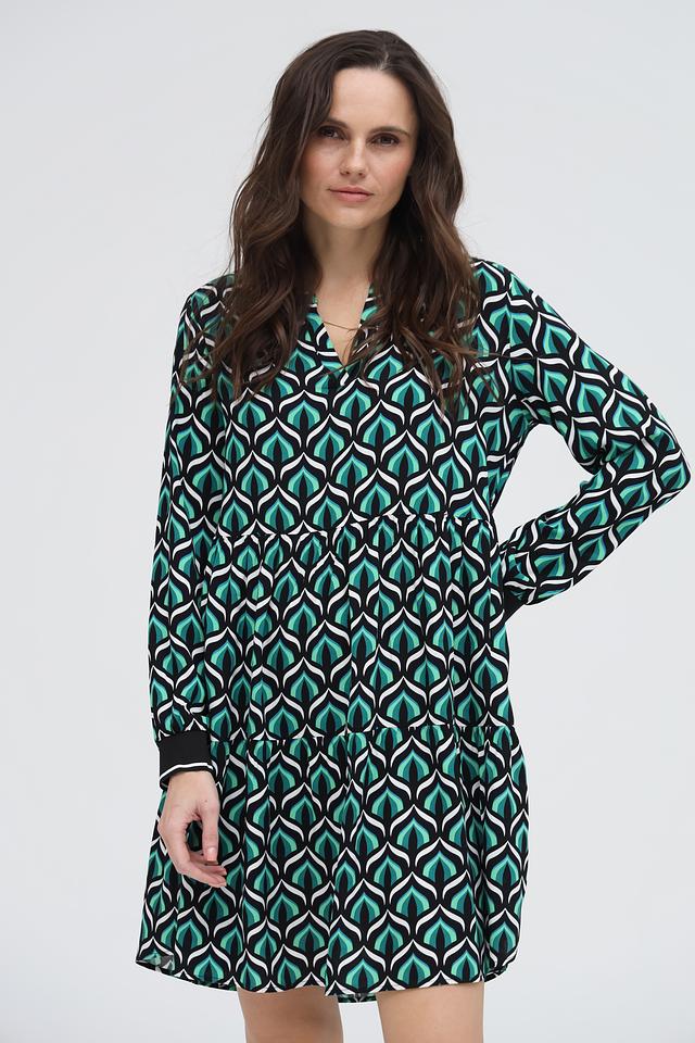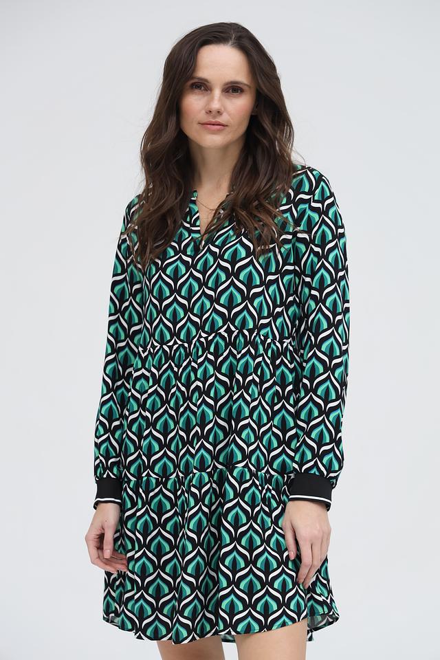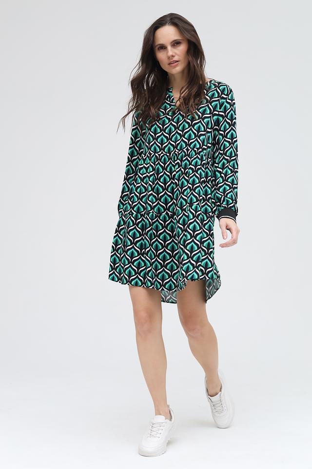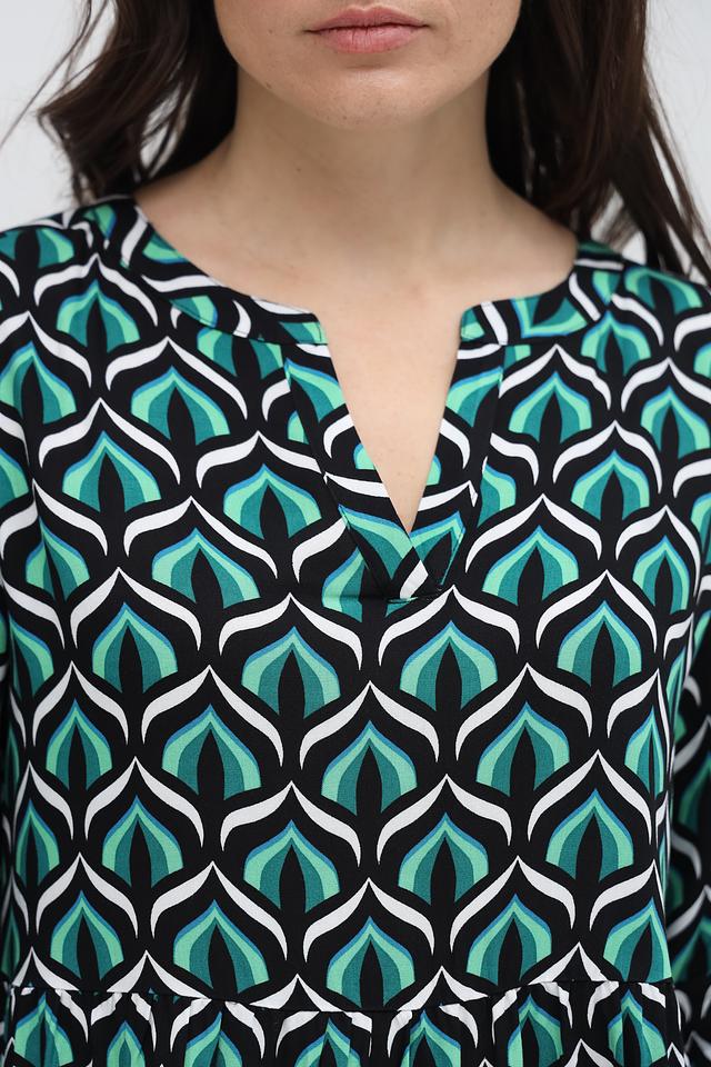 Платье имеет прямой силуэт, длинные рукава и V-образный вырез горловины. Особенностью модели является яркий геометрический принт в бирюзовых, белых и черных тонах, который придает образу оригинальность и динамичность.
