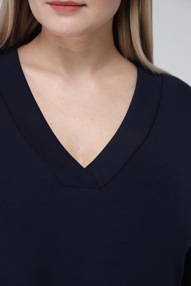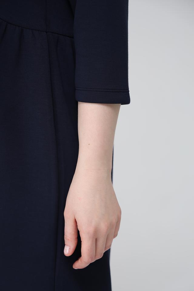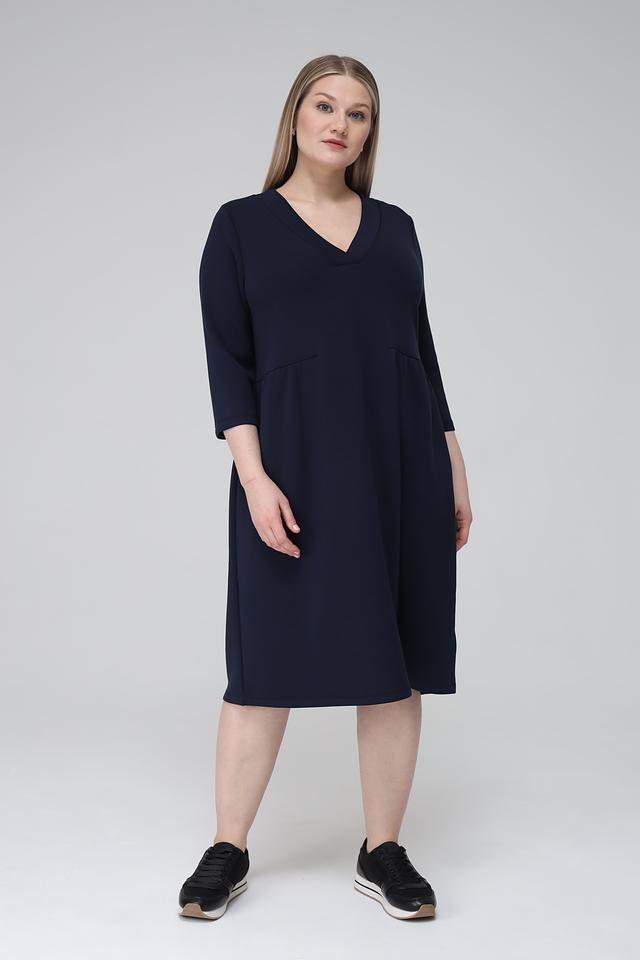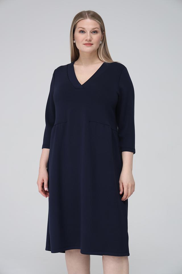 Платье имеет прямой силуэт, V-образный вырез горловины и рукава длиной 3/4. На талии предусмотрена небольшая сборка, которая создает легкий акцент и подчеркивает фигуру. Боковые швы дополнены функциональными карманами.