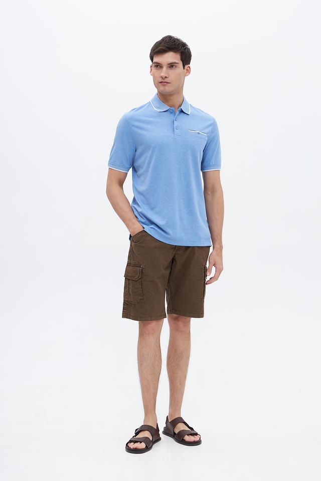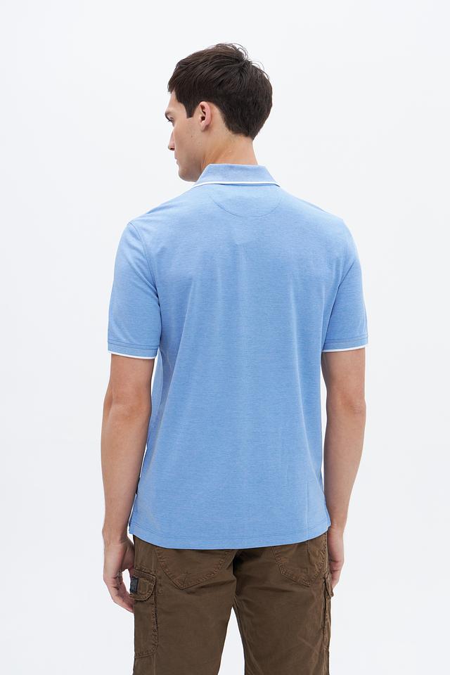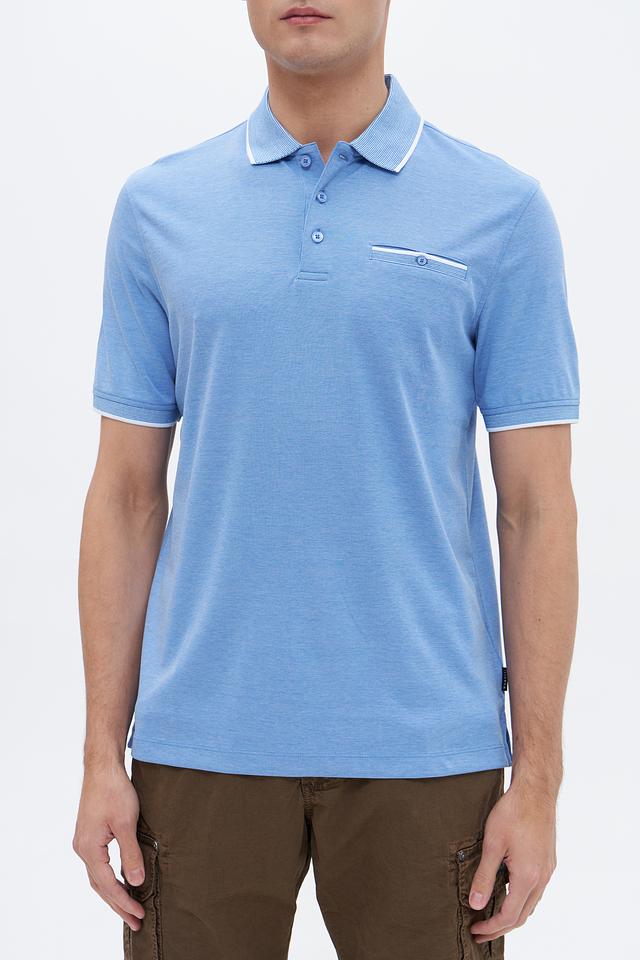 Мужское поло Bugatti голубого цвета с коротким рукавом и белой отделкой на воротнике и рукавах. Изготовлено из сочетания хлопка и полиэстера, обеспечивающего комфорт и практичность. Состав: полиэстер 50%, хлопок 50%