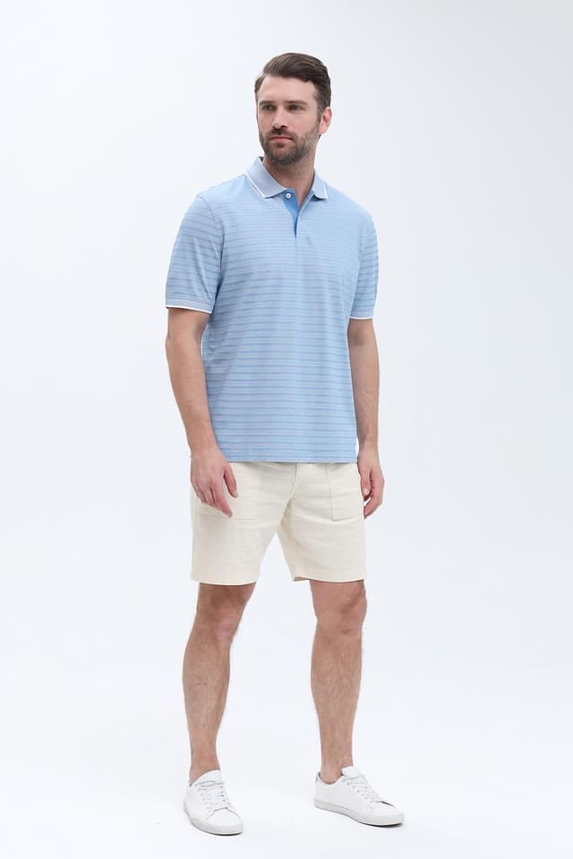 Поло имеет короткий рукав и стандартный крой, обеспечивающий свободу движений. Воротник-поло оформлен контрастной белой окантовкой, что придает изделию более выразительный вид. Спереди расположены пуговицы в тон изделия.