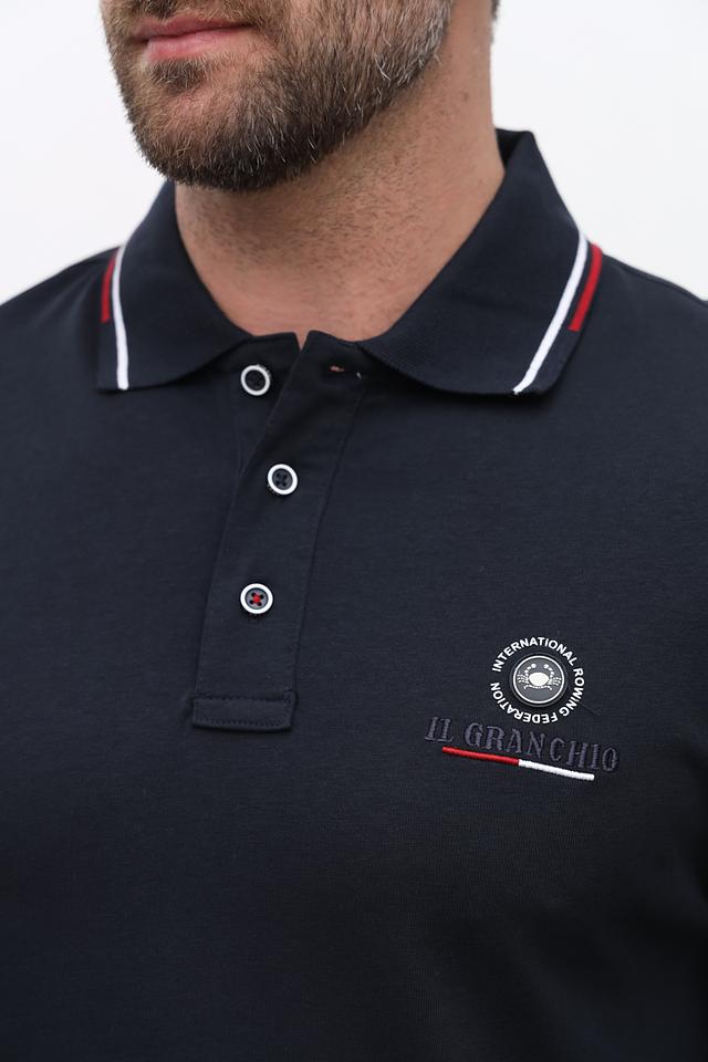 Воротник поло оформлен тонкой красной и белой полоской, добавляющей контраст и динамику образу. На груди расположена вышивка с логотипом бренда Il Granchio.