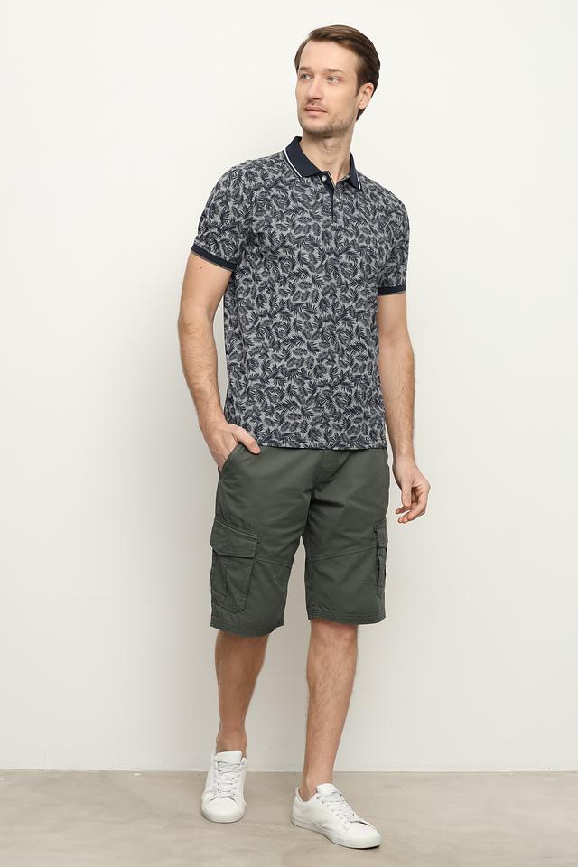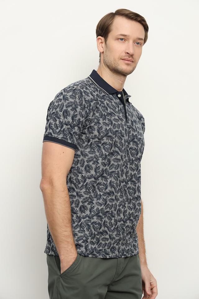 Поло имеет классический крой и короткие рукава. Отличительной особенностью является стильный принт с растительным орнаментом в синих и серых тонах, который придаёт изделию индивидуальность.