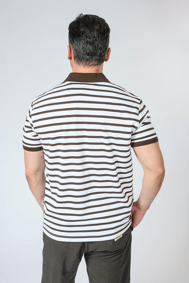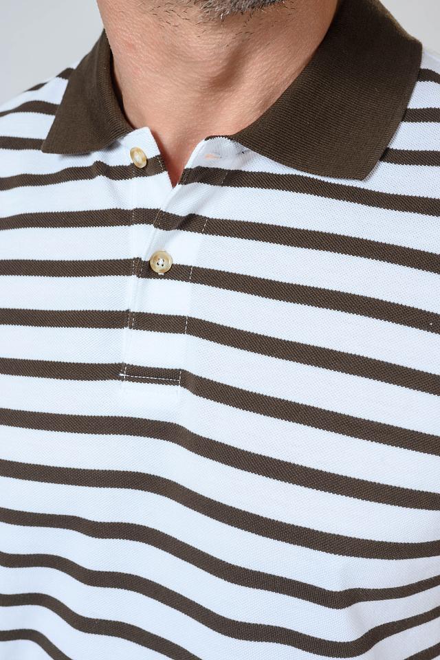 Основной цвет поло – белый, дополненный широкими коричневыми полосами. Такое сочетание делает изделие универсальным и легко сочетаемым с различными элементами гардероба. Воротник и манжеты также выполнены в коричневом цвете, что придает поло завершенный вид.