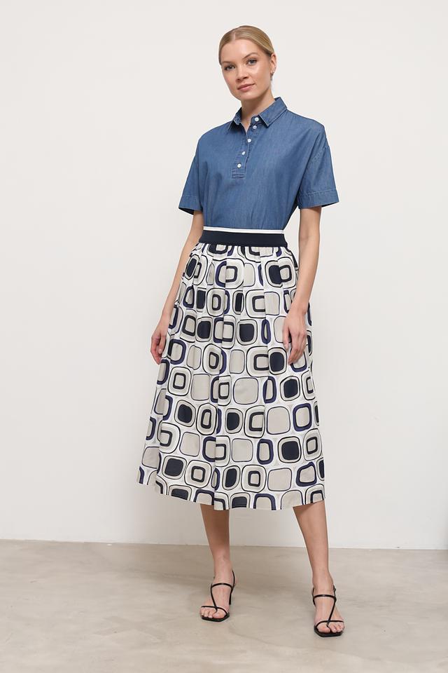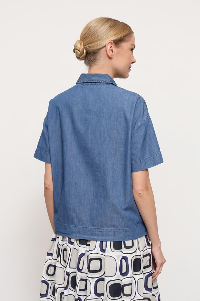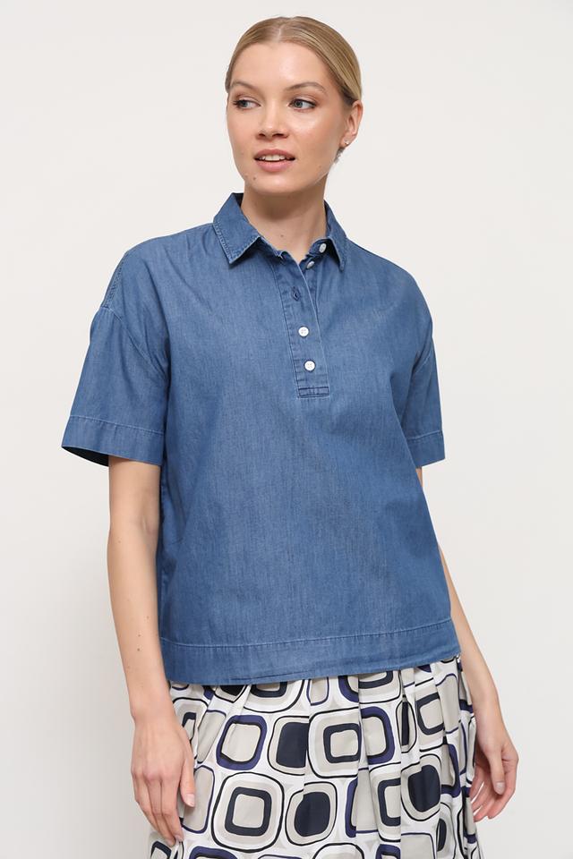 Это поло от бренда Maerz выполнено в виде свободной блузы из джинсовой ткани синего цвета. Модель имеет короткий рукав и воротник-поло с застежкой на три пуговицы.