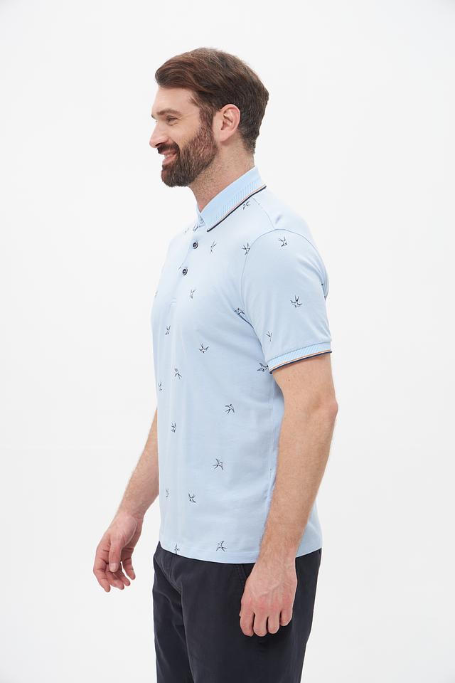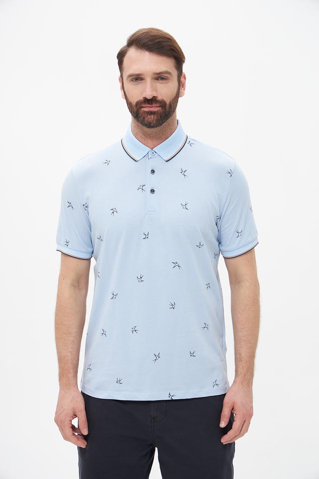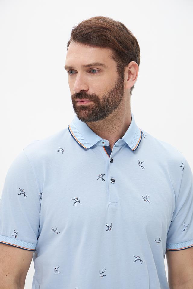 Голубое поло Monte Carlo из 100% хлопка с оригинальным принтом. Классический крой и комфортный материал обеспечивают удобную посадку и приятные ощущения при носке. Состав: хлопок 100%