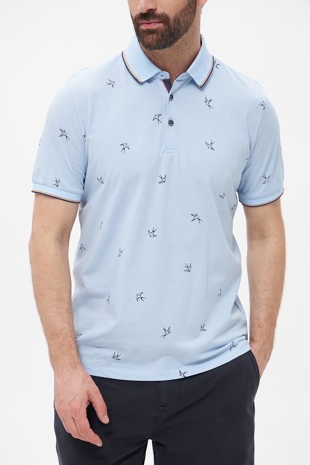 Особенностью данной модели является стильный принт с изображением птиц, который добавляет образу индивидуальность и свежесть. Воротник и рукава поло оформлены контрастной окантовкой, что подчеркивает внимание к деталям.