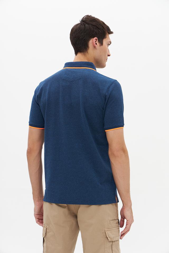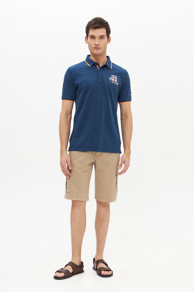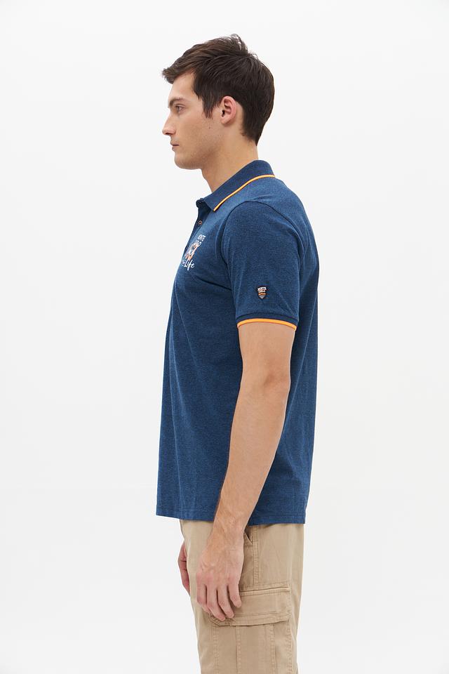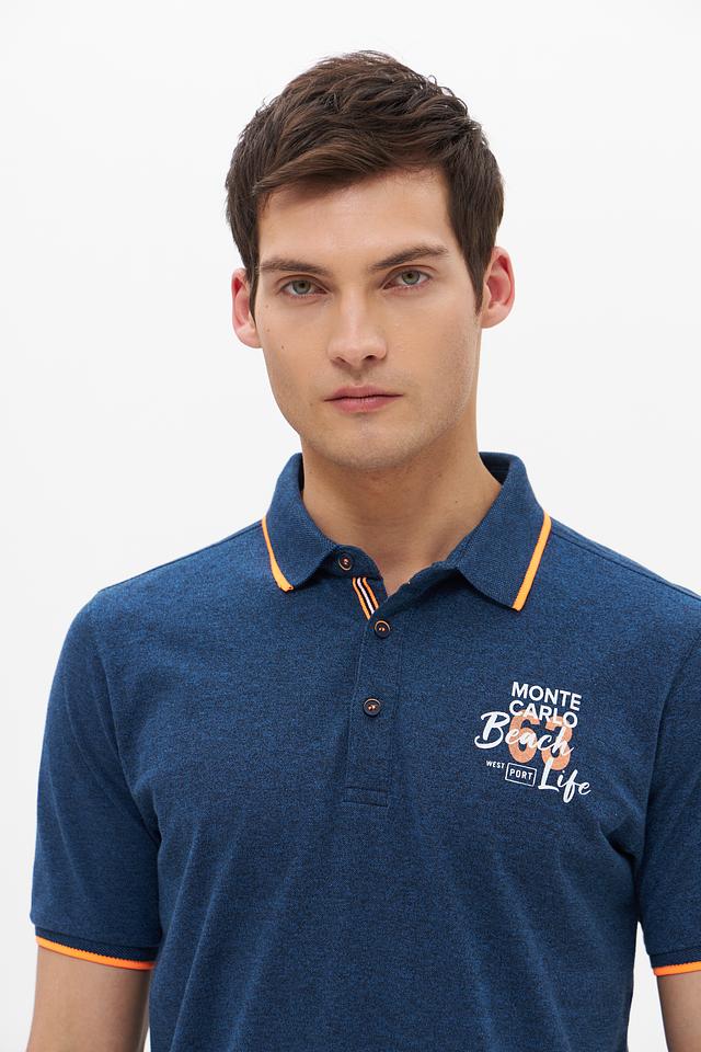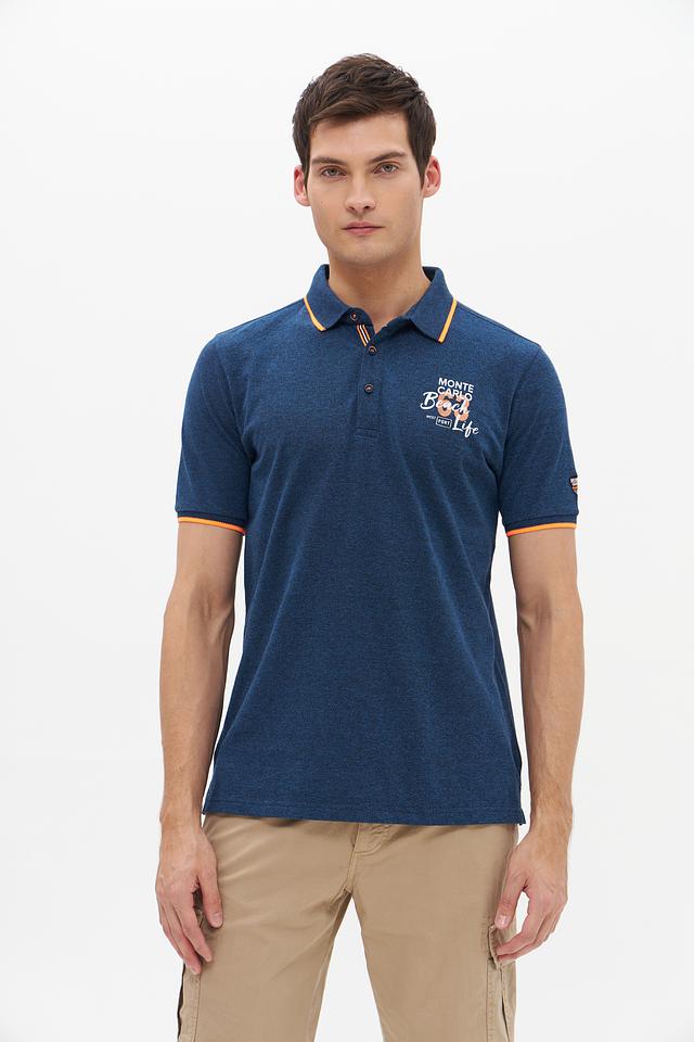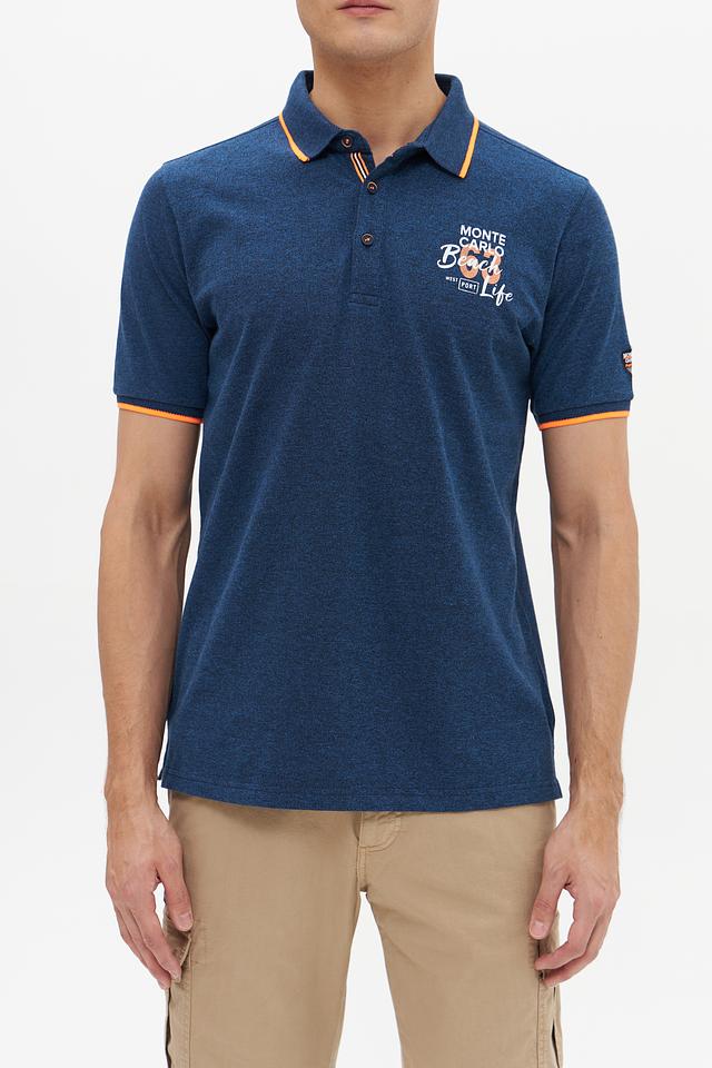 Мужское поло от Monte Carlo выполнено в насыщенном синем цвете. Модель имеет классический крой, короткий рукав и воротник-поло с оранжевой окантовкой.