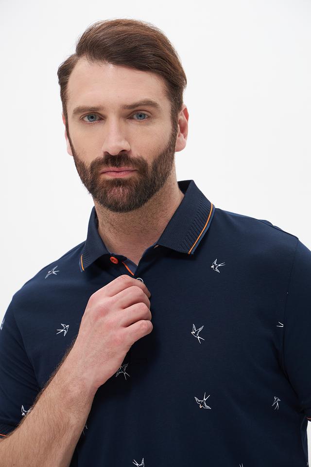 Это мужское поло от Monte Carlo выполнено в классическом крое из высококачественного хлопка. Тёмно-синий цвет поло служит идеальным фоном для стильного принта с изображением птиц, добавляющего образу оригинальность.