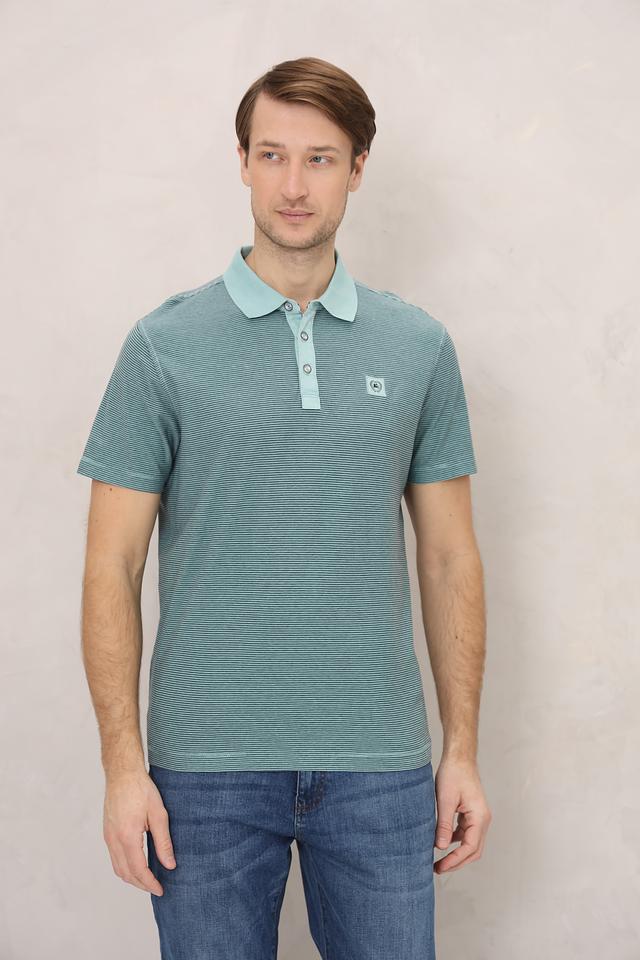 Мужское поло от Lerros выполнено в приятном мятном цвете с вертикальной полосатой текстурой. Изделие имеет классический крой, короткие рукава и воротник-поло с тремя пуговицами.