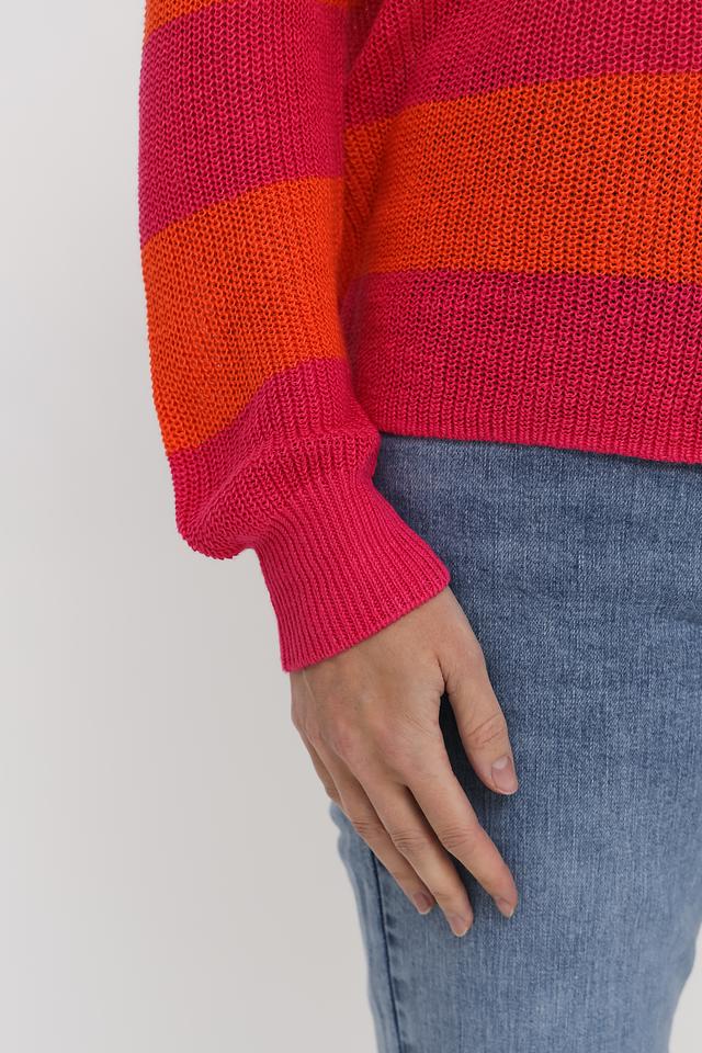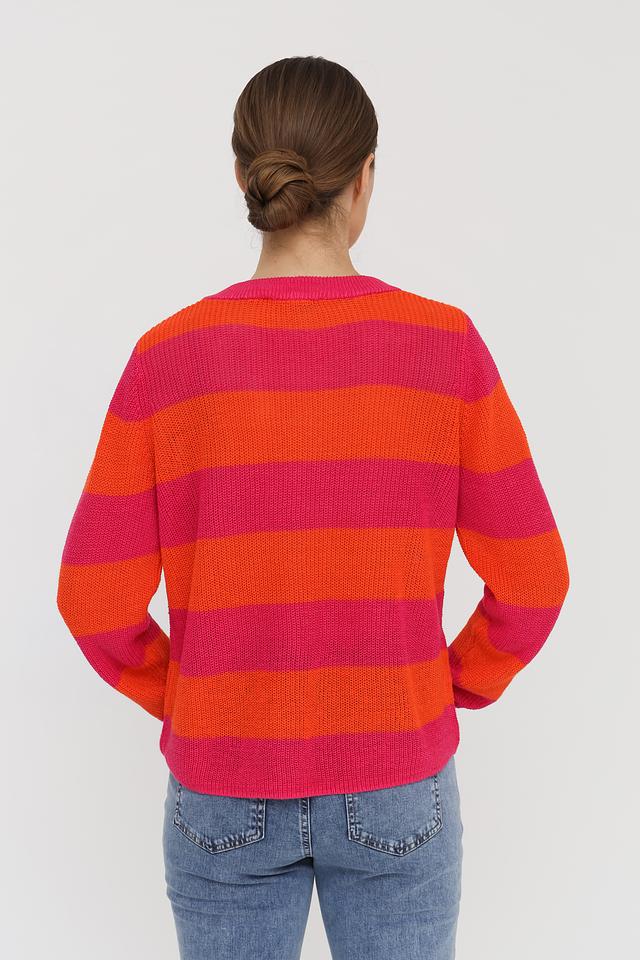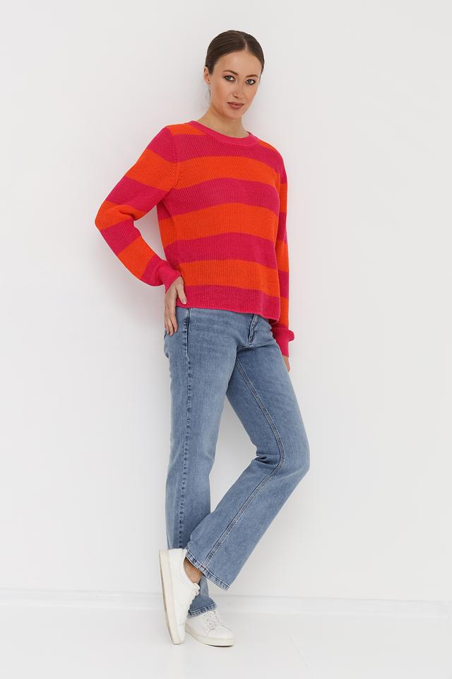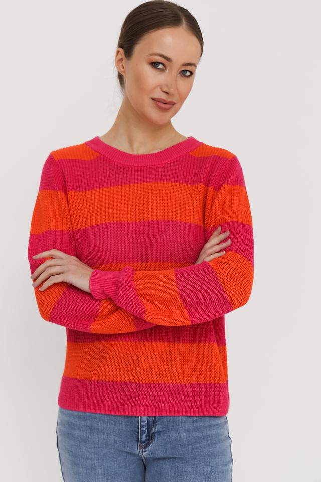 Дизайн пуловера выполнен в виде широких горизонтальных полос оранжевого и розового цветов, что придает ему динамичный и привлекательный вид. Круглый вырез горловины и длинные рукава делают его универсальным для различных погодных условий.