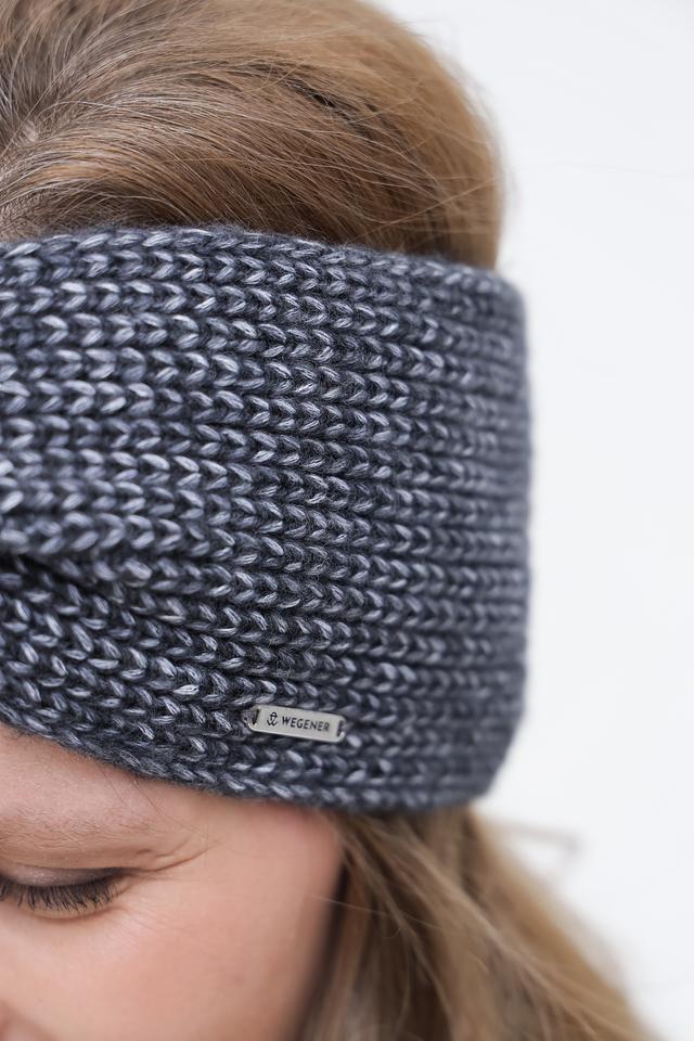 Повязка имеет вязаную текстуру и стильный дизайн с перекрученным элементом. Цвет – серый с меланжевым эффектом. Небольшой логотип бренда Wegener аккуратно размещен сбоку.