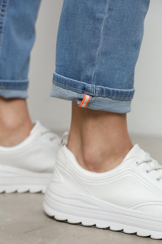 Особенностью данной модели является декоративная вышивка на кармане, выполненная в оранжево-красных тонах, что придает джинсам индивидуальность. Классический пятикарманный крой и аккуратная обработка швов делают эти джинсы универсальным элементом гардероба. Джинсы имеют необработанный низ, который можно подвернуть по своему вкусу.