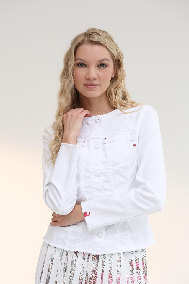 Жакет застегивается на пуговицы, имеет длинные рукава и воротник без лацканов. На груди и рукавах присутствуют декоративные элементы в виде небольших вышитых деталей.