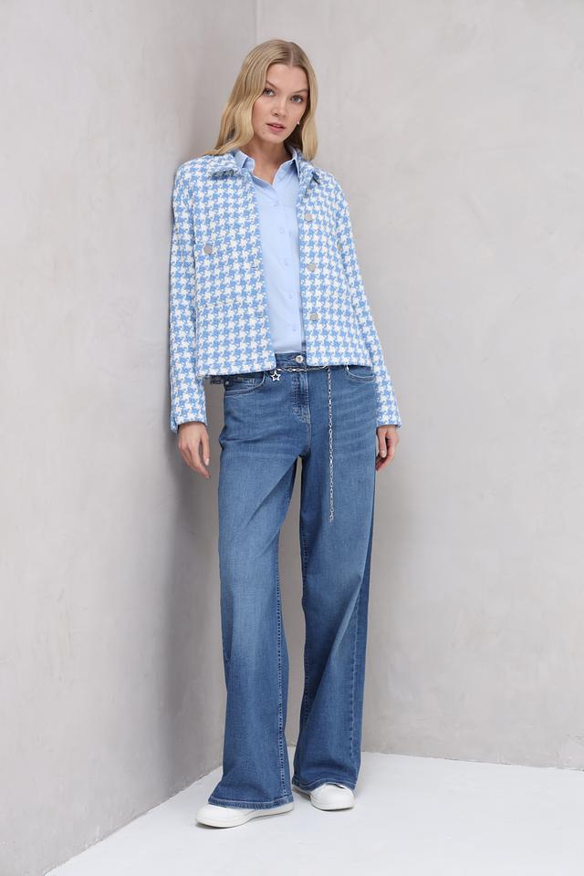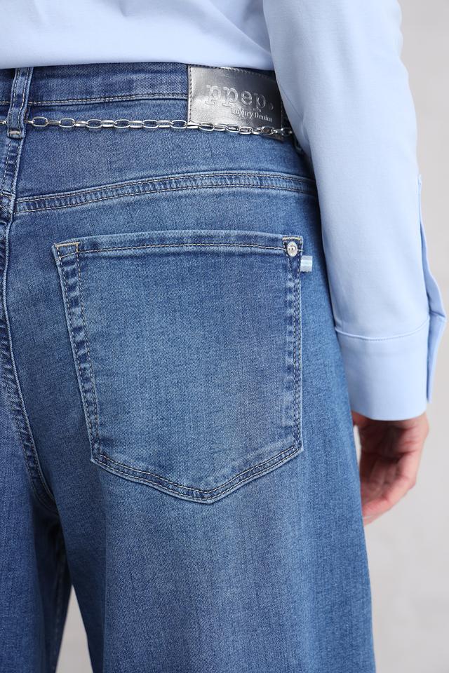 Голубые джинсы Ppep клеш с высокой посадкой и декоративной цепочкой на поясе. Модель выполнена из хлопка с добавлением эластана для комфорта и свободы движений. Состав: хлопок 98%, эластан 2%