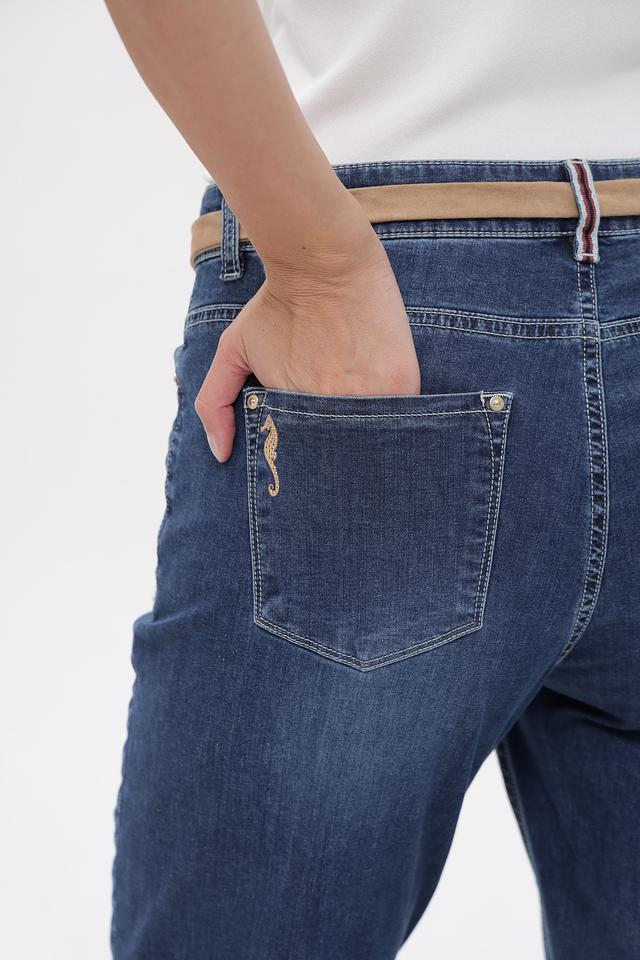 Задние карманы украшены декоративной вышивкой в виде морского конька, добавляющей оригинальности образу. Состав ткани обеспечивает долговечность и удобство при носке. Идеальный выбор для создания повседневных образов.