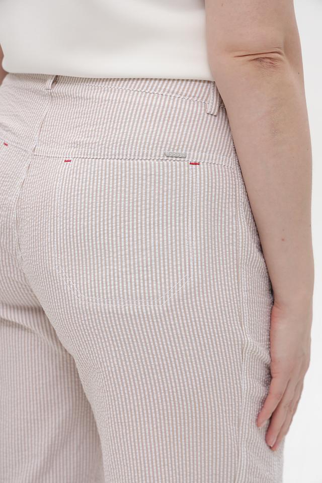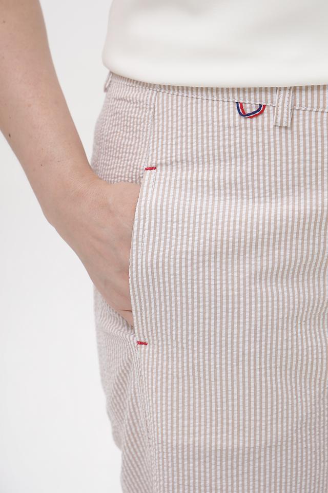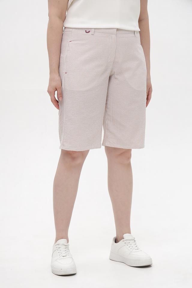 Представляем женские шорты от бренда Ppep, выполненные в бежевую полоску. Модель имеет классический крой и застегивается на молнию и пуговицу.