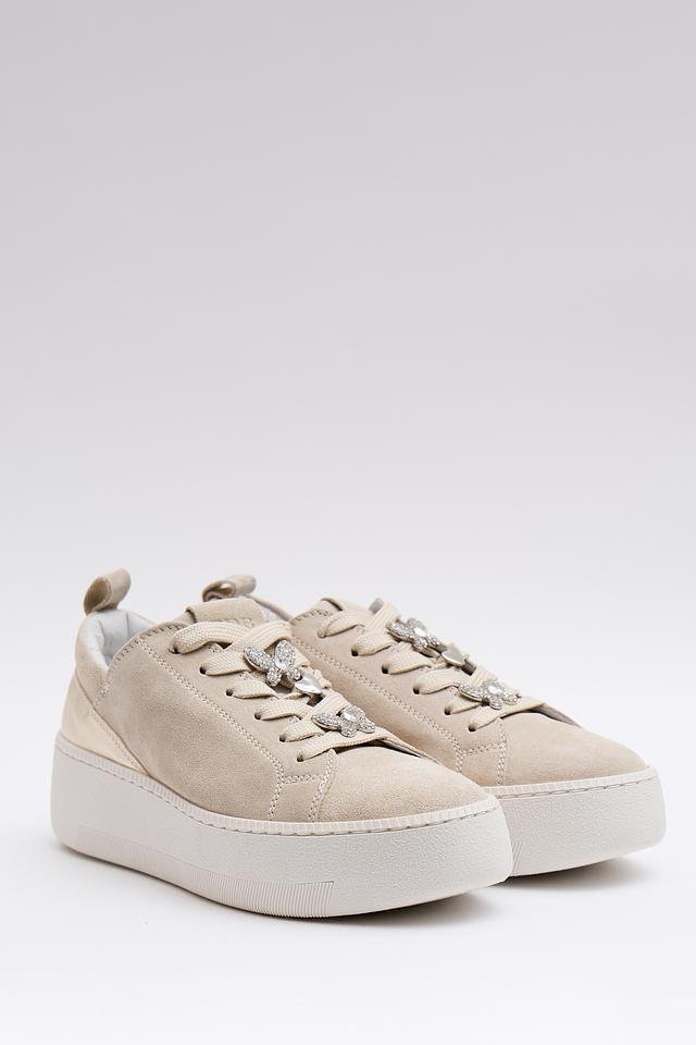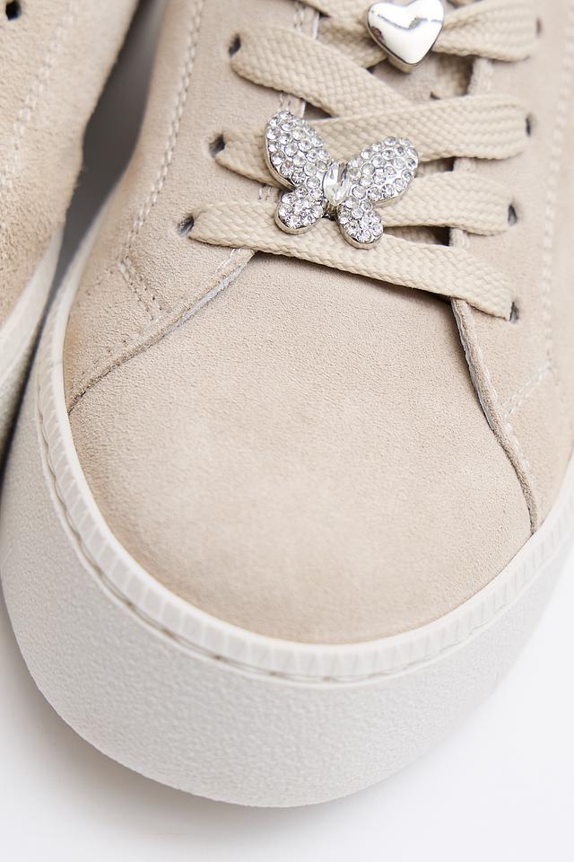 Верх кроссовок изготовлен из высококачественной натуральной кожи, что обеспечивает комфорт и долговечность. Платформа добавляет обуви современный вид и обеспечивает дополнительный комфорт при ходьбе. Декоративные элементы в виде бабочек, украшенные стразами, придают сникерсам изысканность и индивидуальность.