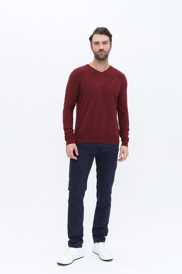 Мужской джемпер Basefield бордового цвета с V-образным вырезом. Изготовлен из мягкого хлопка с добавлением кашемира для комфорта и тепла. Идеально подходит для создания стильного повседневного образа. Состав: хлопок 92%, кашемир 8%