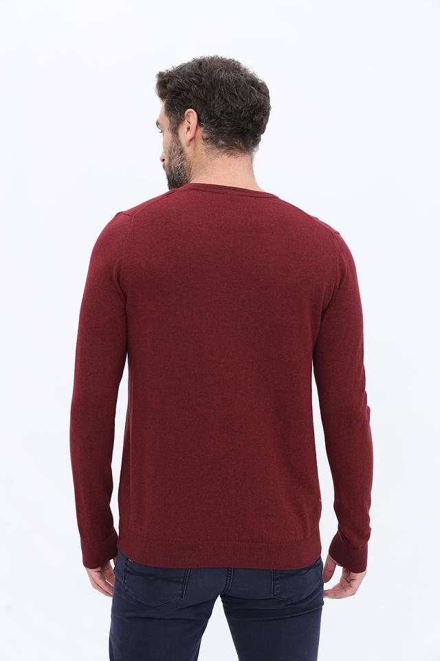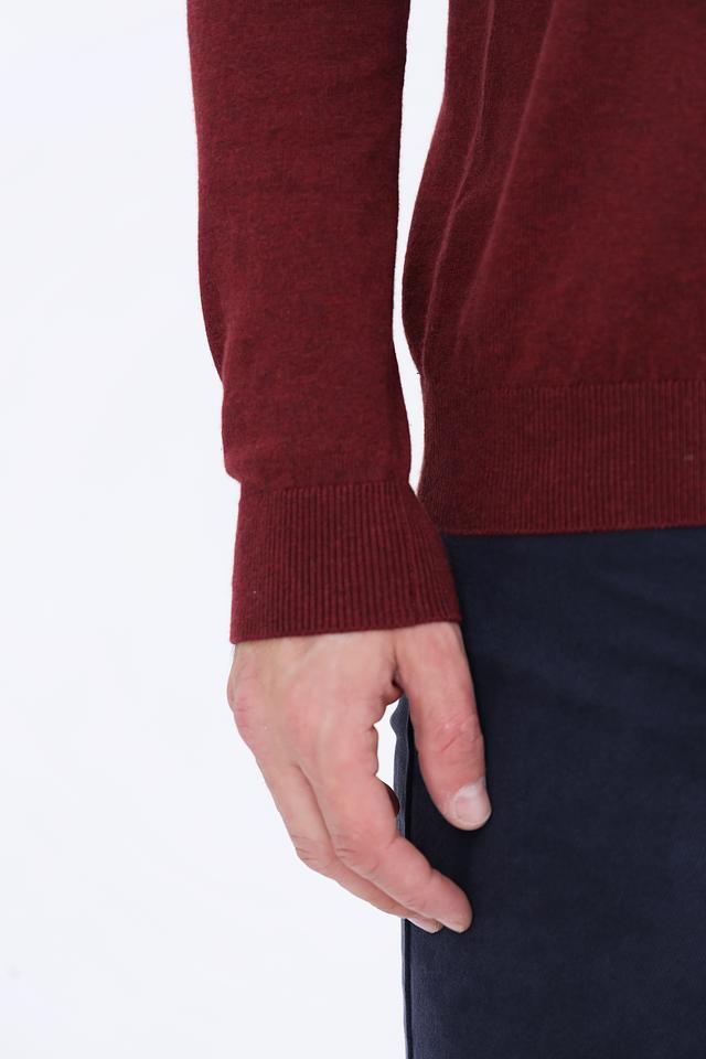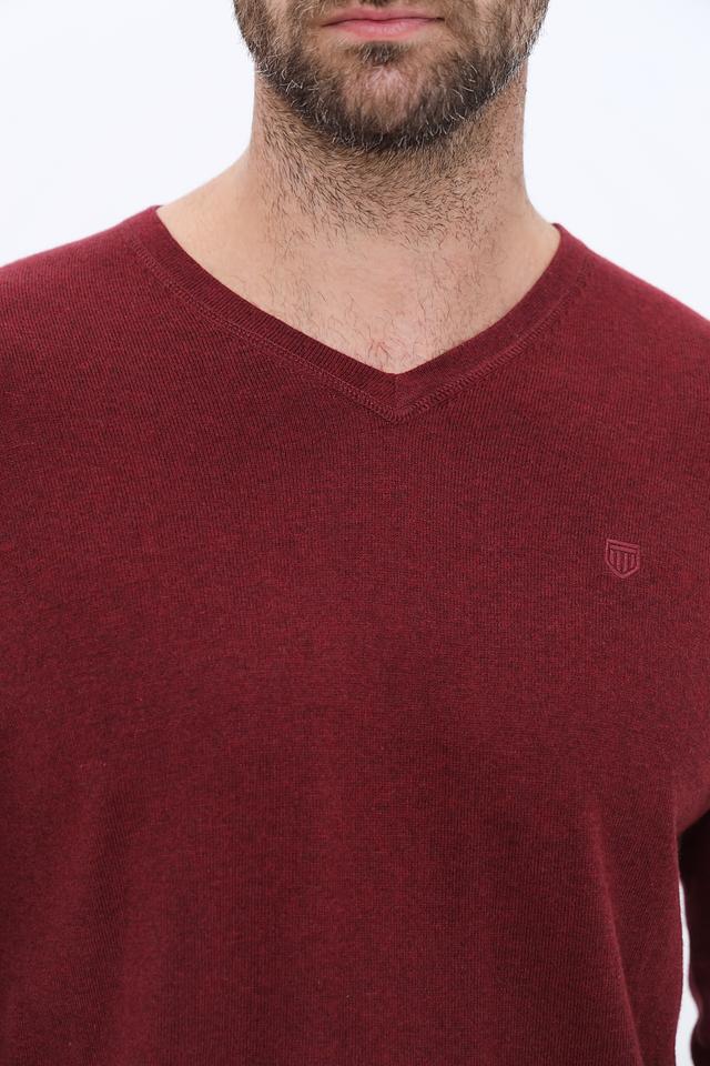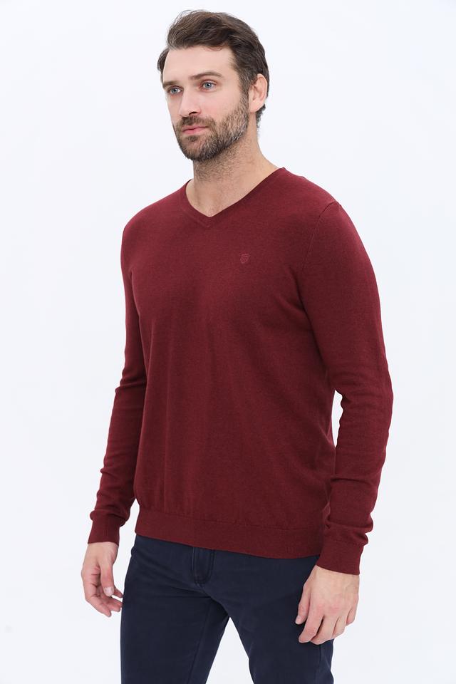 Модель имеет классический крой с V-образным вырезом, который подчеркивает линию шеи и делает образ более элегантным. Бордовый цвет придает джемперу изысканность и позволяет легко сочетать его с различными элементами гардероба.