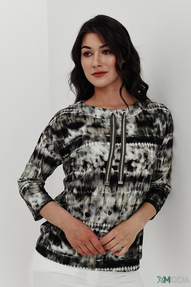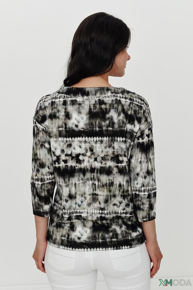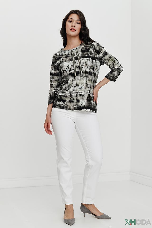 Женский пуловер Betty Barclay чёрно-белого цвета с оригинальным принтом и декоративными завязками на горловине. Модель с рукавом 3/4 выполнена из мягкого и приятного к телу трикотажа. Состав: вискоза 80%, полиэстер 15%, эластан 5%